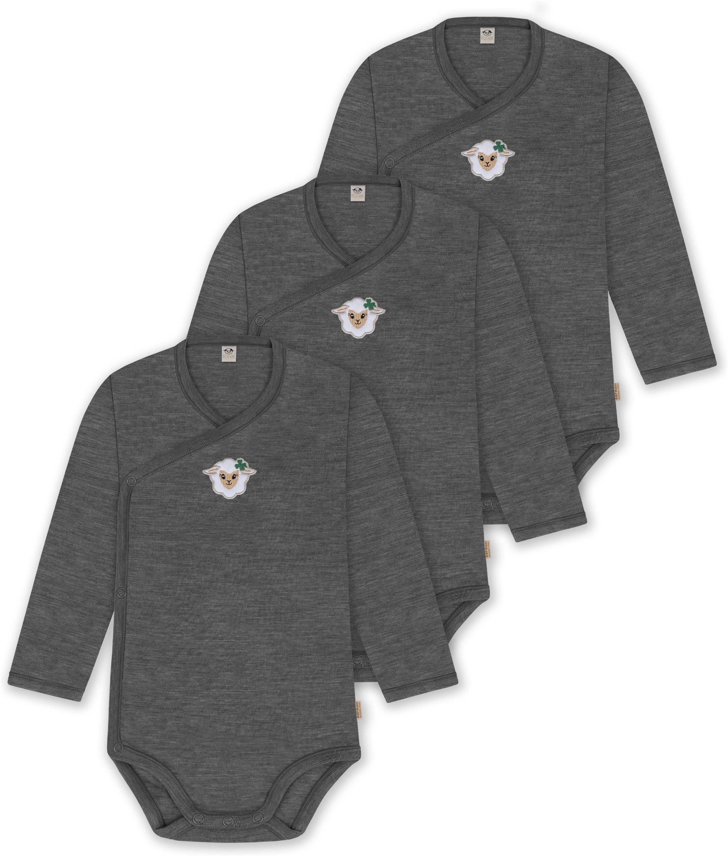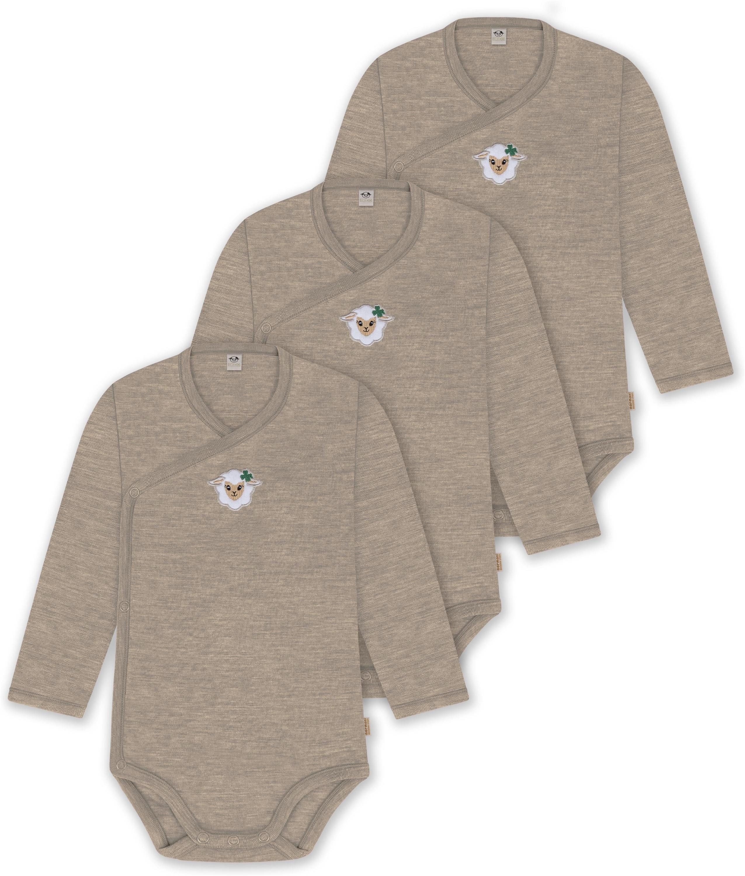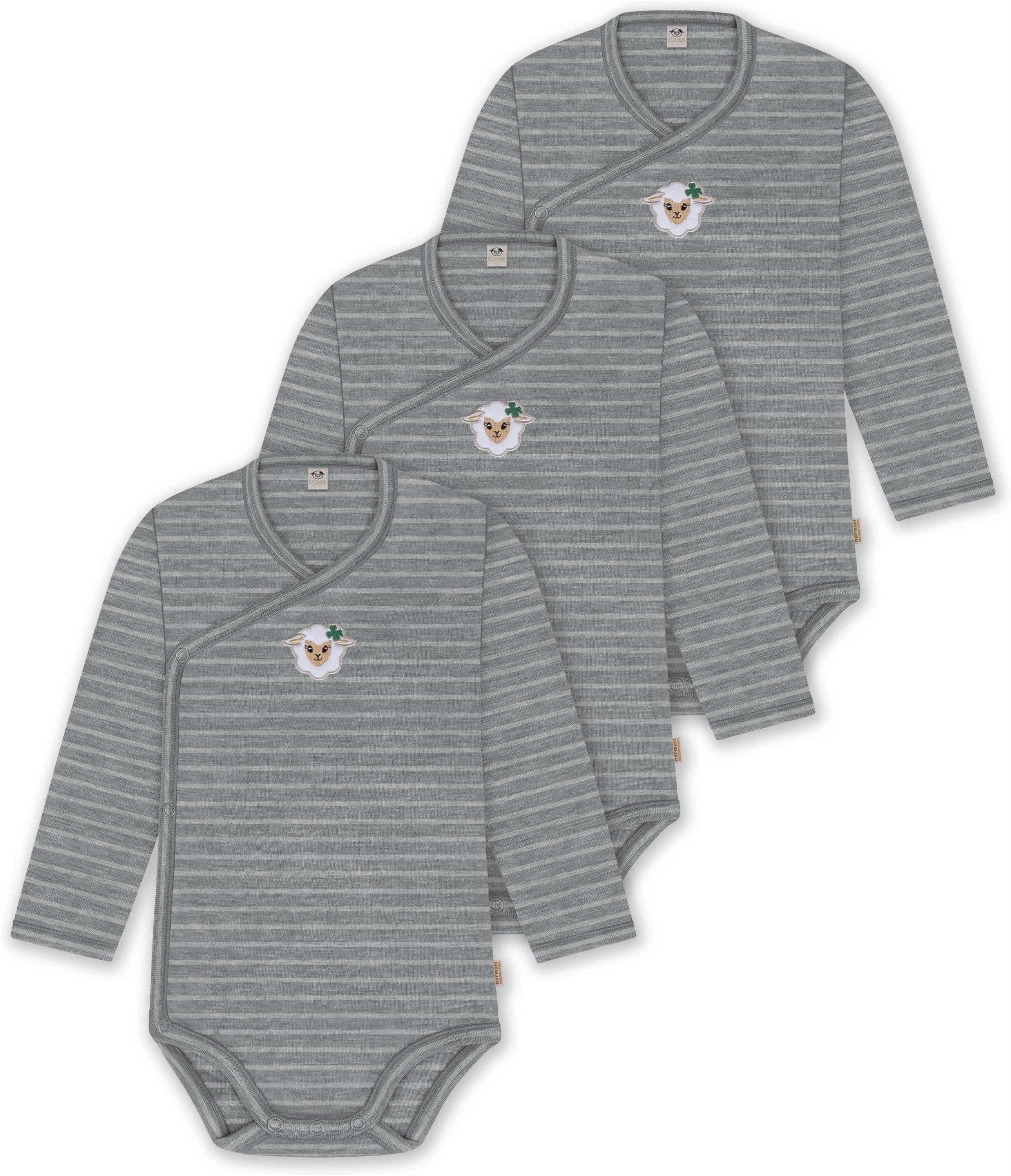 Unser Merino Wickelbody Body "Kaitaia", im 3er Pack, ist mehr als nur ein einfacher Baby Body mit langen Ärmeln. Hinter seiner schlichten Erscheinung verbirgt sich ein Kleidungsstück, das sich perfekt für alle Wetterbedingungen eignet. Mit einer Grammatur von 200 g/m² bietet dieser Body eine optimale Wärmeisolierung, die ihn im Winter zur idealen wärmenden Schicht unter weiterer Kleidung macht. Auch im Sommer kann der Body wegen seiner natürlichen Thermoregulierung einzeln getragen werden. Die Wärmeregulierung und Atmungsaktivität der Merinowolle ermöglichen es Ihrem Baby, den Body den ganzen Tag über zu tragen – sei es beim Spielen oder beim Nickerchen. Die weiche Merinowolle ist besonders sanft zur empfindlichen Haut Ihres Babys und verursacht keine Hautirritationen. Zudem ist die Merinofaser geruchsneutralisierend, sodass der Body auch nach mehrmaligem Tragen frisch bleibt. Die Elastizität der Merinowolle sorgt für maximale Bewegungsfreiheit beim Spielen. Der Wickelbody zeichnet sich besonders dadurch aus, dass er nicht über den Kopf Ihres Babys gezogen werden muss, sondern um Ihr Baby herumgewickelt wird. Darüber hinaus ist der Body mit hochwertigen Marken-Druckknöpfen von YKK zwischen den Beinen und an den Seiten ausgestattet, die ein zuverlässiges Öffnen und Спрятать gewährleisten und das Wickeln erleichtern. Abgerundet wurde der Body mit einem kindgerechtem, flauschigem Schaf Stick, der als Eyecatcher dient.