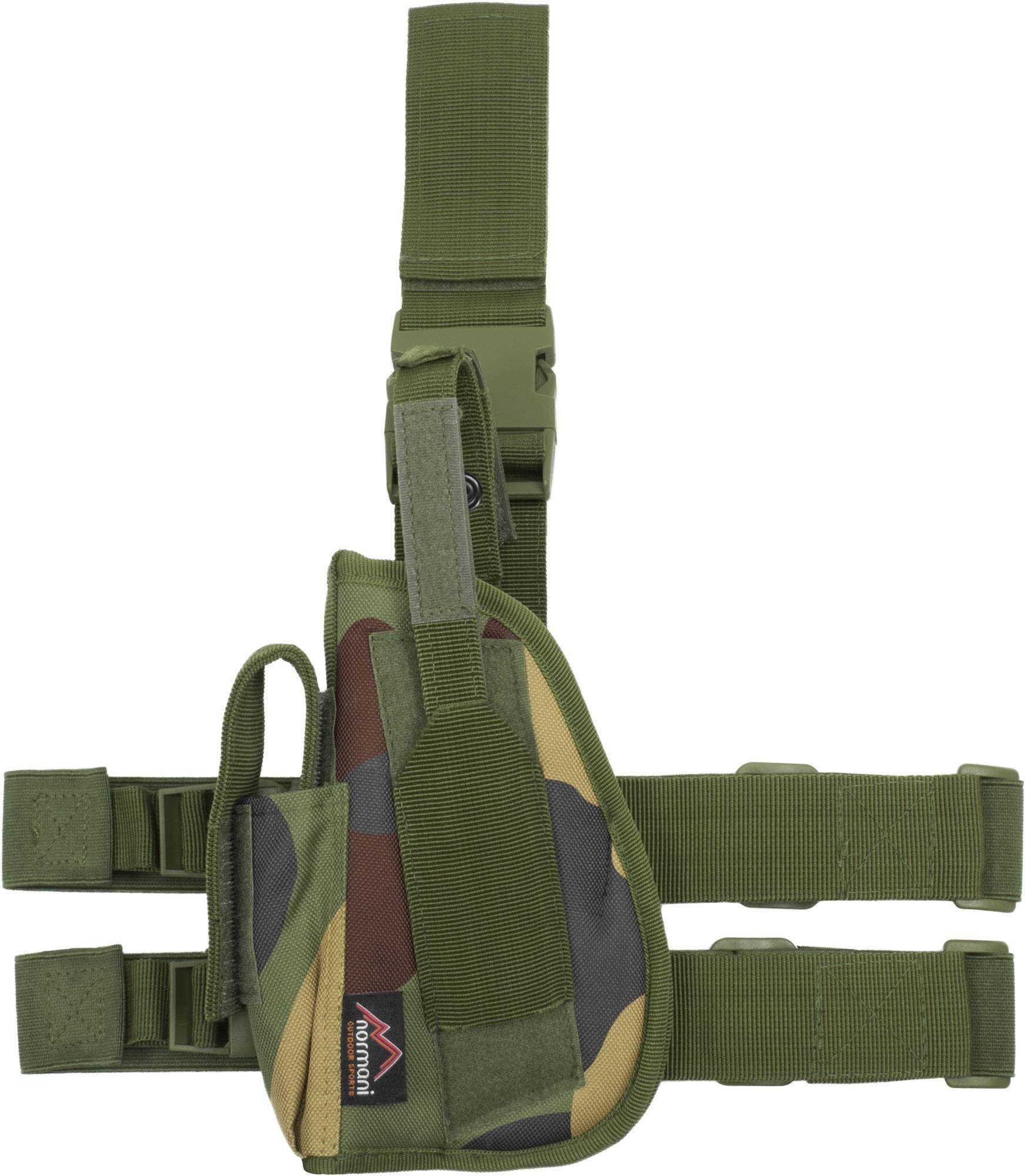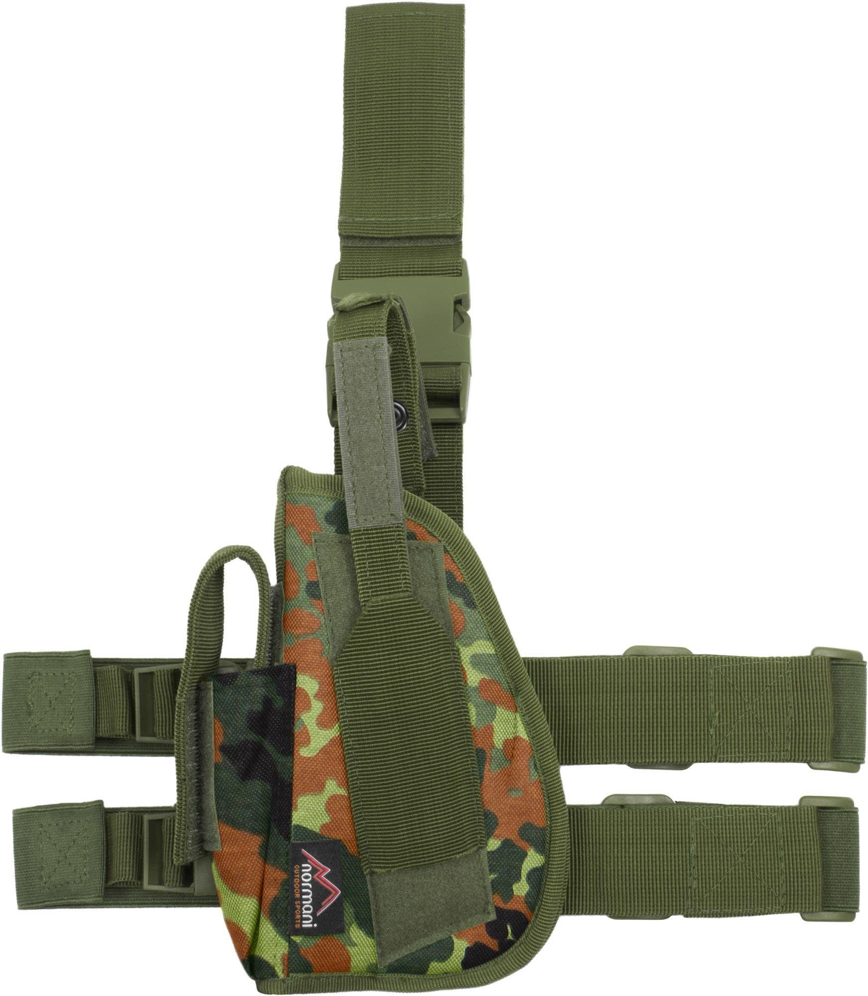 Details: • Holster für alle gängigen Kurzwaffen • Wasserabweisendes Polyester • Waffensicherungsriemen mit Klett und Druckknopf • Aufgesetzte Magazintasche mit Klettverschluss • 2 justierbare, elastische Beingurte • Длинаnverstellbare Gürtelschlaufe, abnehmbar