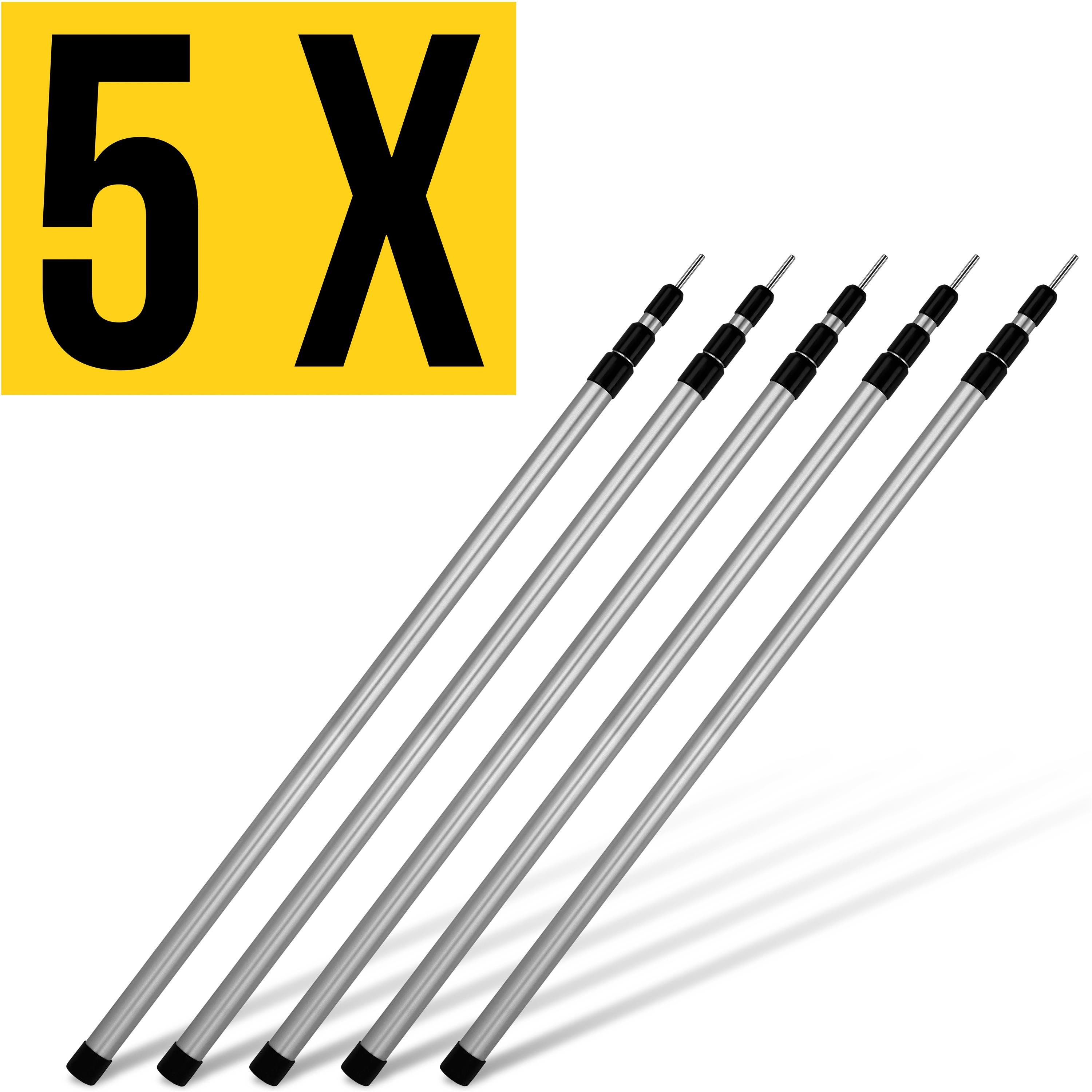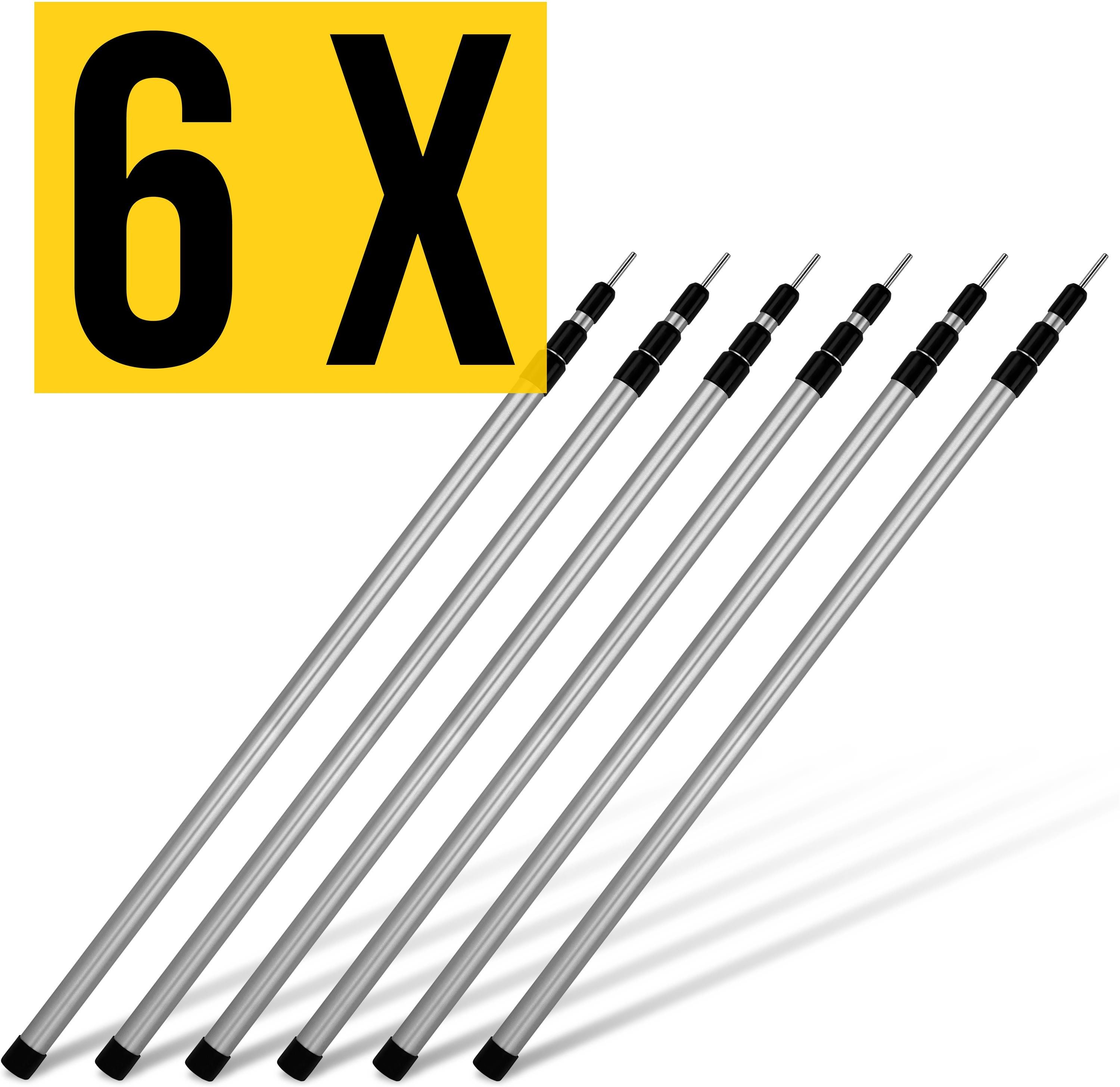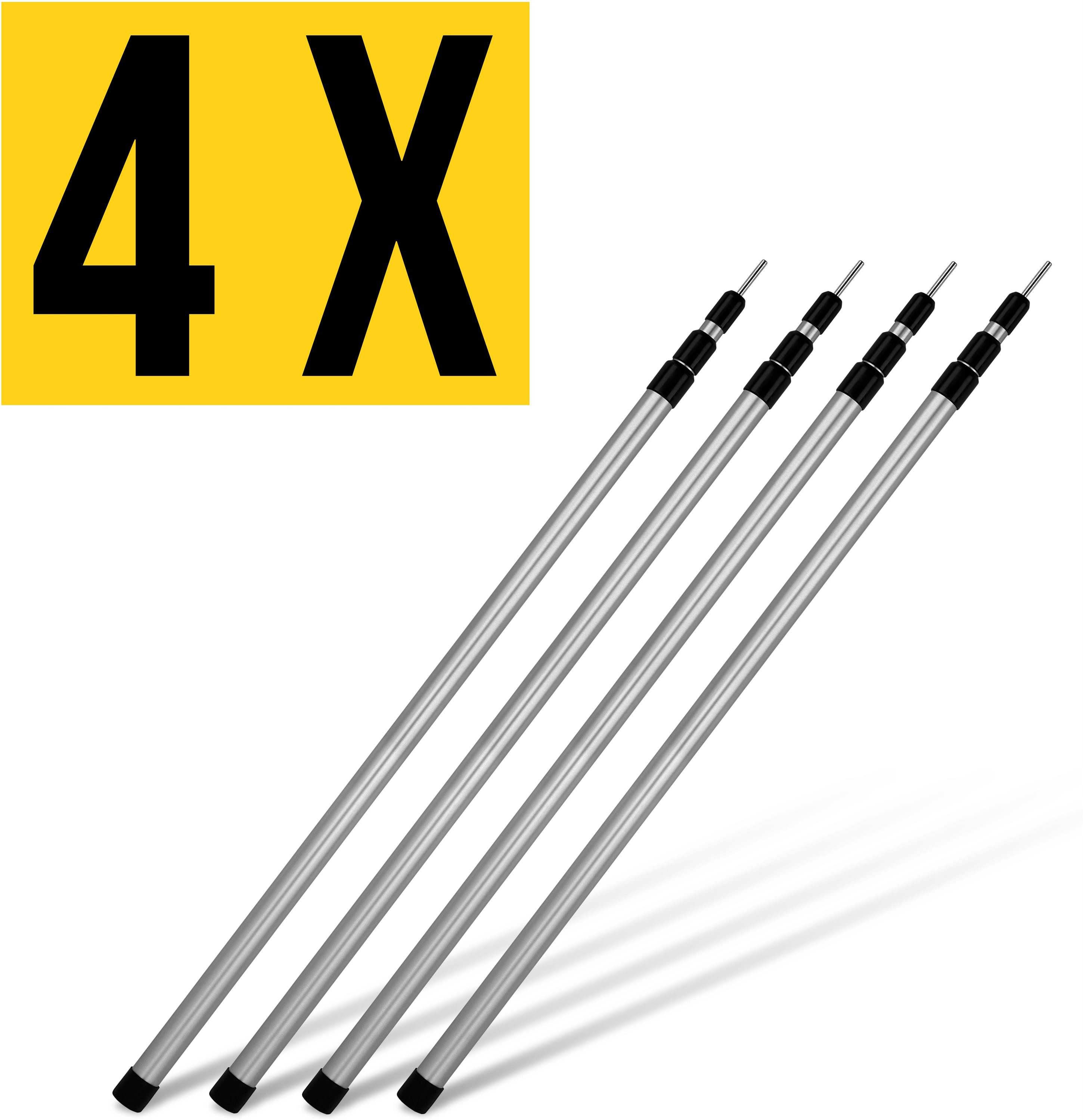 Stabiles Teleskopstangen Set in der ultraleichten, robusten Ausführung aus 6061 Aluminium. Halt und Stabilität mit imposantem Außendurchmesser von 28 mm an dem untersten Segment und 22 mm am obersten. Funktionale Stütze für Sonnensegel, Tarps, Planen, Zeltplanen, Einmann- oder Familienzelte. Die Segmente lassen sich stufenlos in der Höhe verstellen. Kinderleicht auseinandergezogen und in der gewünschten Длина mit einer einfachen Drehung fixiert. Einmal arretiert sorgt der Klemmverschluss für die nötige Stabilität und verhindert ein ineinander rutschen der Stange. Die großen Fußendkappen unterstützen die ausgefahrenen Segmente in ihrer Grundstabilität. Die aufgesetzte Spitze macht die teleskopierbare Stange variabel einsetzbar. Schnell in die Öse des Vorzelts gesteckt und in einer Bewegung aufgespannt.