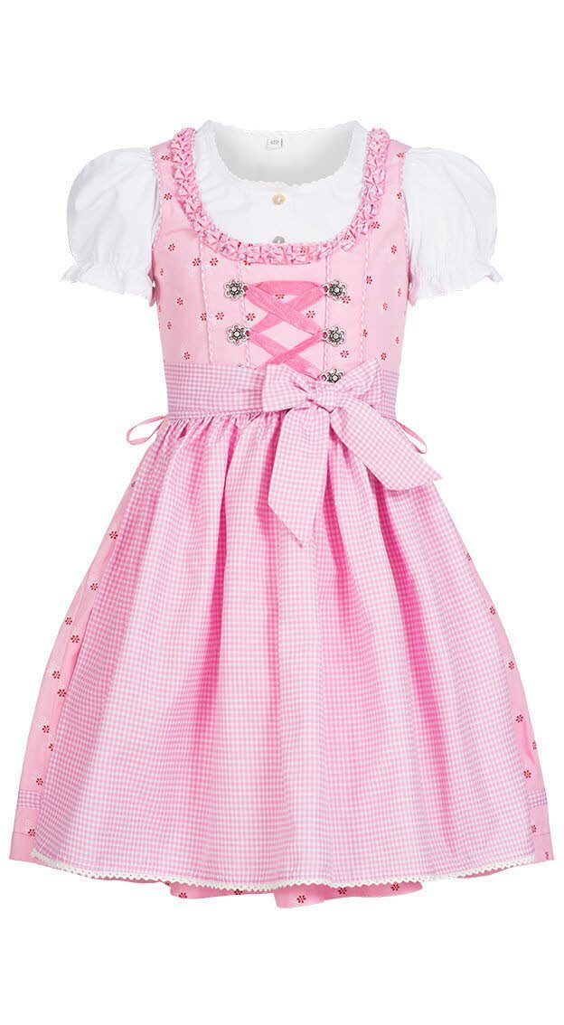 Das Modell Linda ist ein süßes Kinderdirndl aus dem Hause Nübler. Das Dirndl in Rosa ist mit einem Blumenprint versehen. Den runden Ausschnitt umrahmt eine Froschmaulborte. Am Mieder sind Blumen-Ösen angebracht in denen ein rosa Satinband eingefädelt ist. Die Schürze ist rosa-weiß kariert und hat am Saum eine Spitzenborte. Sie passt optisch sehr gut zum Dirndl. Mit diesem Kinder-Dirndl wird das Mädchen garantiert zum Hingucker auf jeder Kirchweih, Hochzeit, Kommunion, Taufe, Firmung, Konfirmation, Familienfest oder jedem anderen Fest.