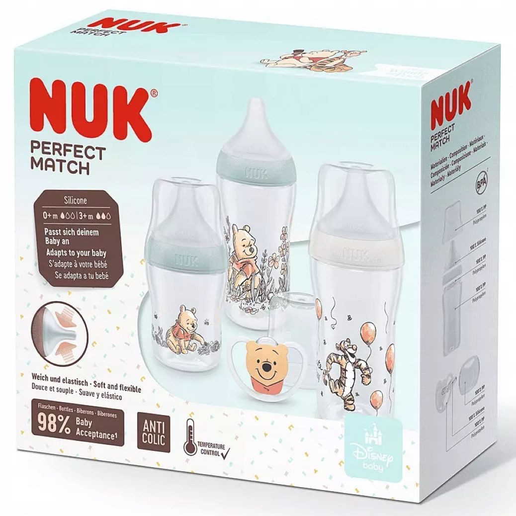 Das NUK Perfect Match Starter-Set Disney Winnie Pooh ist ideal für Babys von Geburt an. Es enthält drei Babyflaschen mit Temperaturanzeige sowie einen hochwertigen Silikon-Schnuller (0–6 Monate) in einem praktischen Reiseetui. Die innovativen Perfect Match Sauger passen sich dem Mund des Babys optimal an – weich, flexibel und dem Stillen nachempfunden. Das integrierte Anti-Kolik-Ventil sorgt für einen gleichmäßigen Trinkfluss und reduziert Koliken. Die NUK Temperaturanzeige zeigt sofort an, ob die Milch zu heiß ist – für mehr Sicherheit beim Füttern. Die Flaschen bestehen aus nur vier Teilen, sind leicht zu reinigen, auslaufsicher und besonders handlich. Der NUK Space Schnuller mit großen Belüftungsöffnungen ist besonders sanft zur empfindlichen Babyhaut. Все Teile sind BPA-frei und werden in Deutschland nach höchsten Qualitätsstandards hergestellt. Lieferumfang: 1x Babyflasche 150 ml (Sauger S, 0m+) 2x Babyflasche 260 ml (Sauger M, 3m+) 1x Silikon-Schnuller Space 0–6m + Etui
