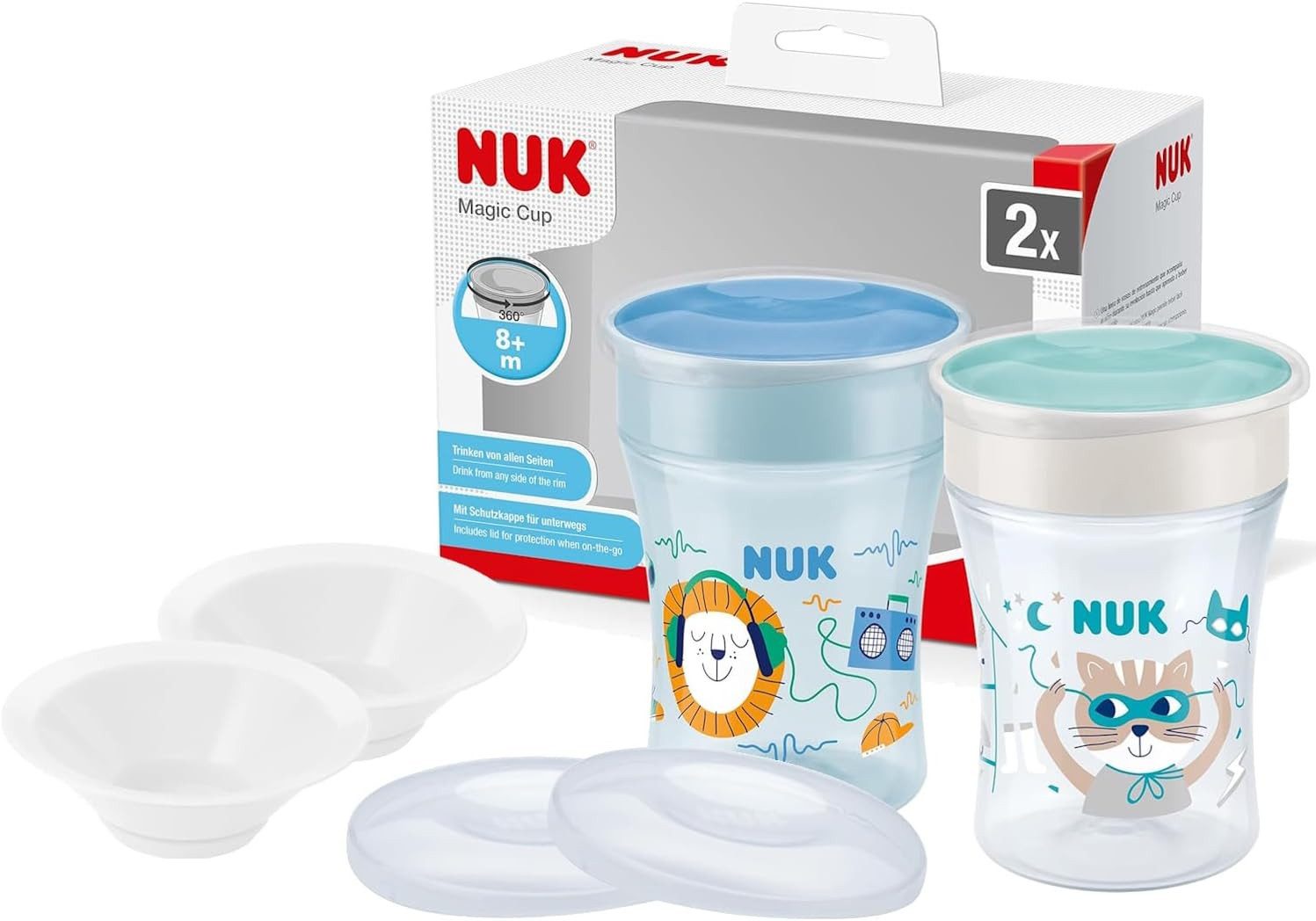 Das NUK Magic Cup 2er Set ist die perfekte Lösung für Eltern, die nach einem zuverlässigen und kindgerechten Trinklernbecher für ihr Baby oder Kleinkind suchen. Ob für den Alltag zu Hause oder unterwegs – dieses Bundle bietet alles, was kleine Entdecker brauchen, um selbstständig trinken zu lernen. Enthalten sind zwei hochwertige Magic Cups (jeweils 160?ml oder 230?ml, je nach Set), inklusive zwei Ersatzdeckeln und zwei Trinktüllen. Das auslaufsichere Design sorgt dafür, dass nichts verschüttet wird – ideal für aktive Kinderhände und den Einsatz in der Kita, im Kinderwagen oder am Esstisch. Die Becher bestehen aus BPA-freiem, robustem Material, das für höchste Sicherheit und Langlebigkeit entwickelt wurde. Dank der weichen Trinktülle und der ergonomischen Form lernen Babys spielerisch den Übergang vom Fläschchen zum Becher. Viele Sets überzeugen mit liebevollen Motiven wie Tieren oder farbenfrohen Designs, die Kinder zum Trinken animieren. Einige Вариантыn bieten sogar spezielle Features wie Leuchteffekte im Dunkeln (GITD), was sie ideal für die Nacht macht. Die Reinigung ist denkbar einfach: Все Bestandteile sind spülmaschinengeeignet und leicht zu handhaben. Mit den mitgelieferten Ersatzteilen ist eine langanhaltende Nutzung garantiert – nachhaltig und praktisch zugleich. Ob für Babys ab 6 Monaten oder Kleinkinder ab 8 Monaten – mit dem NUK Magic Cup 2er Set gibst du deinem Kind genau das richtige Trinklernwerkzeug an die Hand. Vertraue auf die bewährte Qualität von NUK – für einen sicheren Start ins selbstständige Trinken.