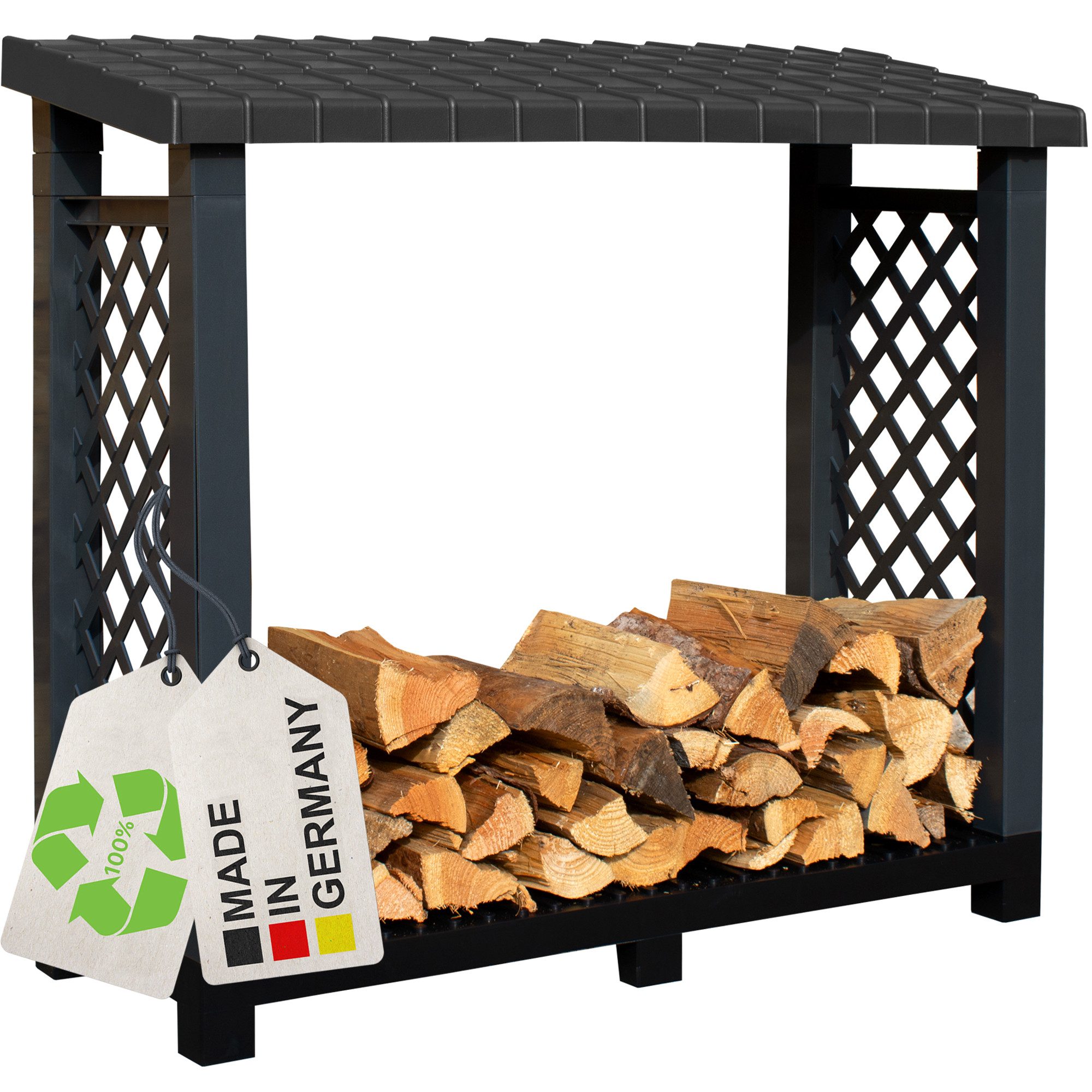 Dank des wetterfesten & recycelten Kunststoffs (Polypropylen) ist das Kaminholzregal besonders robust und langlebig. Es kann den unterschiedlichsten Witterungsbedingungen standhalten, ohne seine Form oder Farbe zu verlieren. Zudem ist es resistent gegen Schimmel, Fäulnis und Insektenbefall.