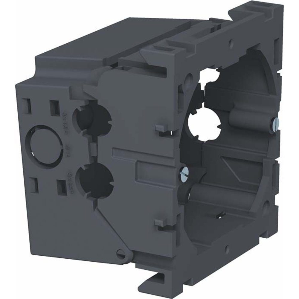 Frontrastende Geräteeinbaudose mit abklappbarem und bei Bedarf auch entfernbarem Unterteil zum zeitsparenden Leitungsanschluss, mit Zuführungsöffnungen für Leitungsdurchmesser bis 14 mm
