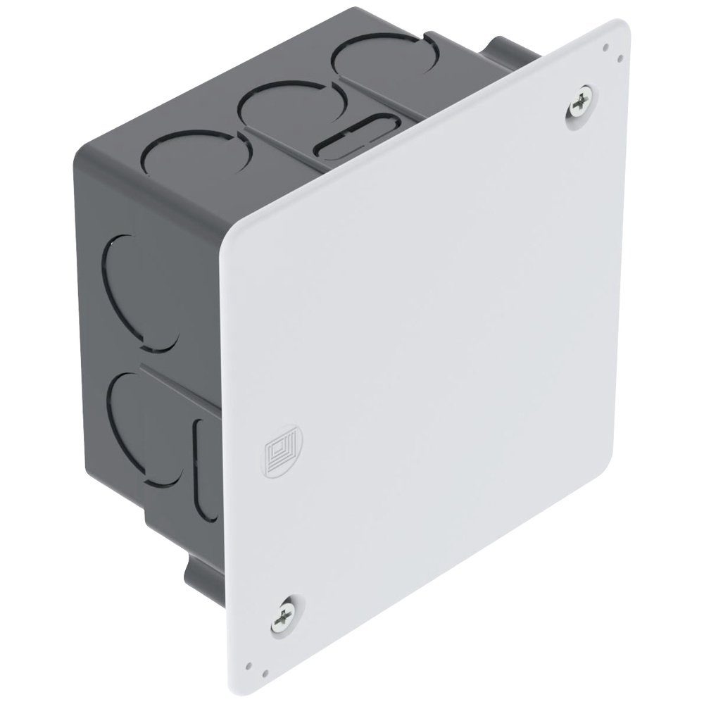 Verbindungskasten für das Verklemmen von Klemmen, mit Deckel und Deckelschraube (15 mm), Deckelrand liegt plan auf, Oberfläche ist aufgeraut, in Verbindung mit Deckel und Deckelschrauben erreichen die Verbindungsdosen das VDE-Prüfzeichen nach VDE 0606 und werden flammwidrig nach VDE 0471/DIN 695 Teil 2-1, Prüftemperatur 750 °C, Schutzart IP20