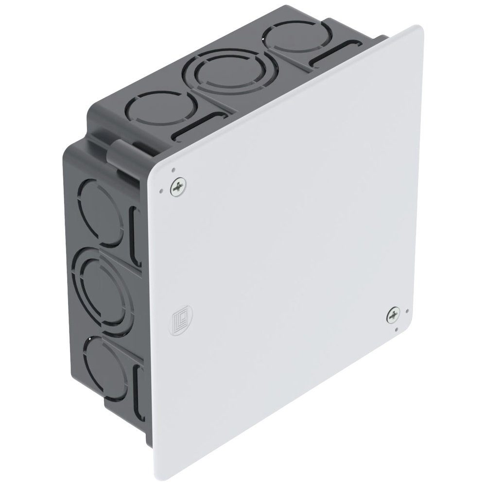 Verbindungskasten für das Verklemmen von Klemmen, mit Deckel und Deckelschraube (15 mm), Deckelrand liegt plan auf, Oberfläche ist aufgeraut, in Verbindung mit Deckel und Deckelschrauben erreichen die Verbindungsdosen das VDE-Prüfzeichen nach VDE 0606 und werden flammwidrig nach VDE 0471/DIN 695 Teil 2-1, Prüftemperatur 750 °C, Schutzart IP20