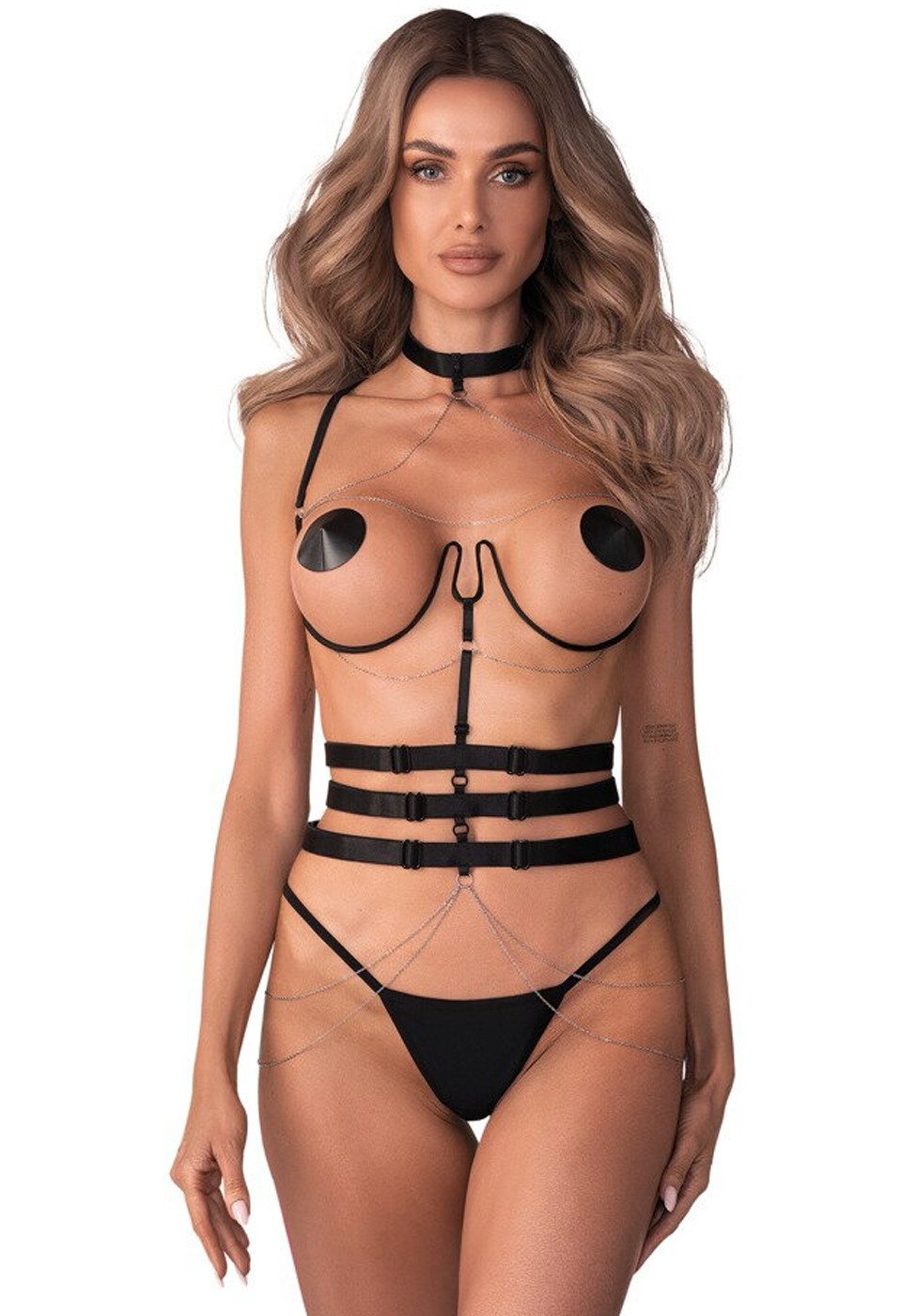 Das Premisis Black Dessous ist die Essenz selbstbewusster Weiblichkeit – entworfen, um deine Vorzüge hervorzuheben und aufregende, intime Momente zu entfachen. Mit gezielten Bügeln unter der Brust formt es deine Silhouette, während breite Taillenriemen Stabilität und Stärke verleihen. Ein raffinierter Choker mit dekorativer Kette zieht den Blick nach unten, wo kunstvoll arrangierte Riemen und funkelnde Silber-Details deinen Körper wie Schmuck umrahmen. Jedes Element ist auf Komfort und perfekten Sitz ausgelegt – verstellbare Riemen und praktische Verschlüsse machen das Tragen zum puren Vergnügen. Zieh es an, wenn du überraschen, verführen und deine kühnsten Fantasien zum Leben erwecken willst. String nicht im Lieferumfang enthalten.