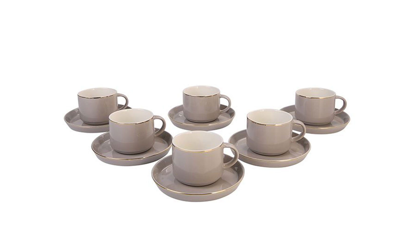 Das Lunel 12er Kaffeetassen Set in Taupe-Gold ist die perfekte Ergänzung für Ihr Kücheninterieur. Die Tassen sind aus hochwertigem Porzellan gefertigt und mit einer goldene Umrandung versehen, die ihnen einen eleganten Look verleiht. Das Set enthält 6 Tassen und 6 Untertassen, die perfekt für eine Tasse Kaffee oder Tee am Morgen oder nach dem Essen geeignet sind.