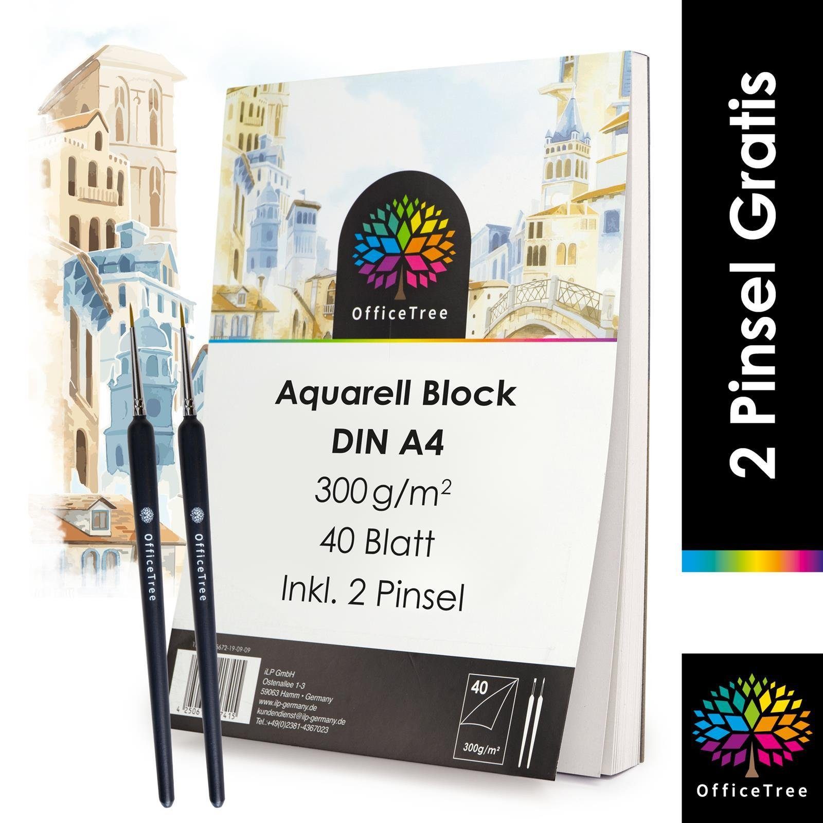 OfficeTree Aquarellblock A4 300g /m² 40 Blatt - Aquarellpapier Weiß - Zeichenblock A4 für Wasserfarben - 2 Pinsel gratis