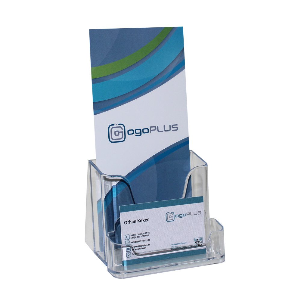 Unser Prospekthalter mit Visitenkartenhalter überzeugt durch seine formschöne außergewöhnliche Verarbeitung und der glänzenden durchsichtigen Optik. Darüber hinaus ermöglicht der Prospektständer Ihnen kreativ zu werden, durch anbringen individueller Logos etc. Des Впередen bietet unser glasklarer Ständer eine ideale sauber geordnete Werbefläche zum Präsentieren von Printwerbung, da das glasklare Kunststoff nicht vom Inhalt ablenkt. Ein weiterer Pluspunkt der von Ihnen möglicherweise zu Nutzen gemachten Werbefläche, ist die leichte Neigung des Transparenten Prospekthalters. Dieses „Feature“ wurde zu Gunsten des besseren Blickfeldes erarbeitet. Ihre Flyer etc. werden somit aufmerksamkeitsstark, sowie platzsparend in den Fokus Ihrer Kunden gerückt. Zudem kommt, dass unser Flyerständer ebenfalls einwandfrei auf allen Ebenen Flächen nutzbar ist. Durch das sauber verarbeitete Polystyrol wird den Seiten, welche sich nach hinten zu den funktionalen Stützen ziehen, nicht nur optimale Standfestigkeit geboten, sondern auch ein durchaus sehenswertes Design.