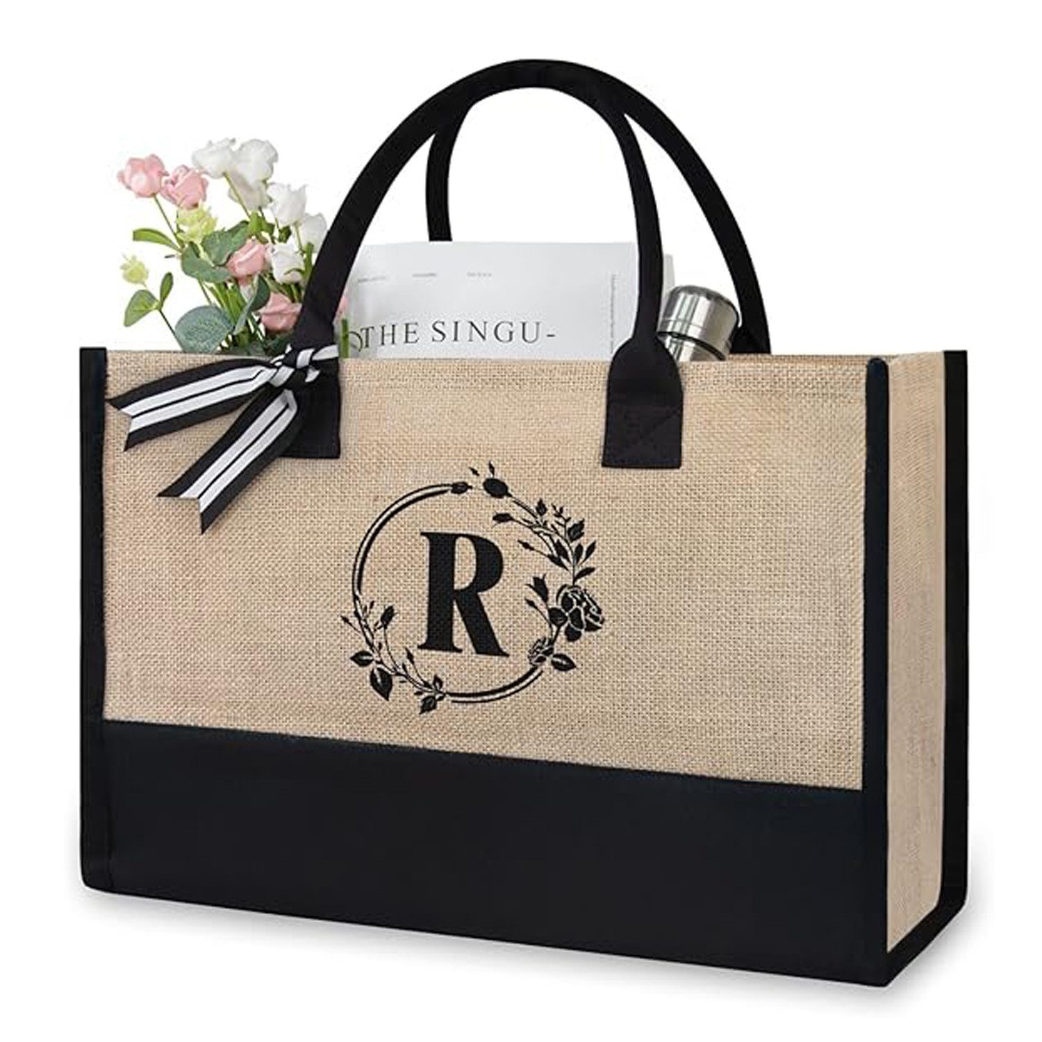 Diese charmante Jutetasche ist mit einem großen Anfangsbuchstaben und floralen Elementen verziert – ein echter Hingucker