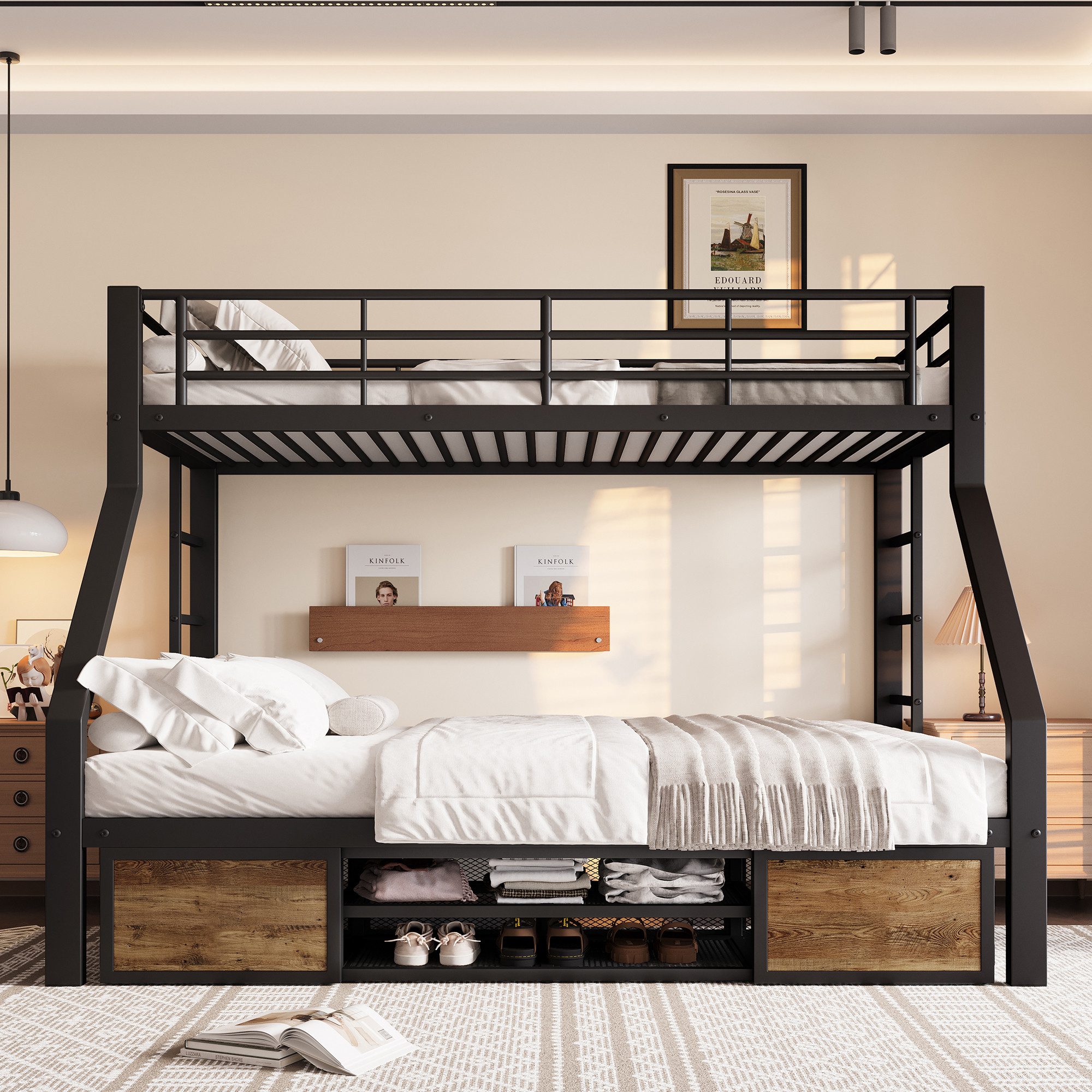 Der clevere Aufbau kombiniert Bett und Aufbewahrung: Ein eingebauter Schuhschrank plus zwei zusätzliche Staufächer ermöglichen die optimale Organisation von Spielzeug, Kleidung oder Schuhen. So bleibt das Zimmer ordentlich.