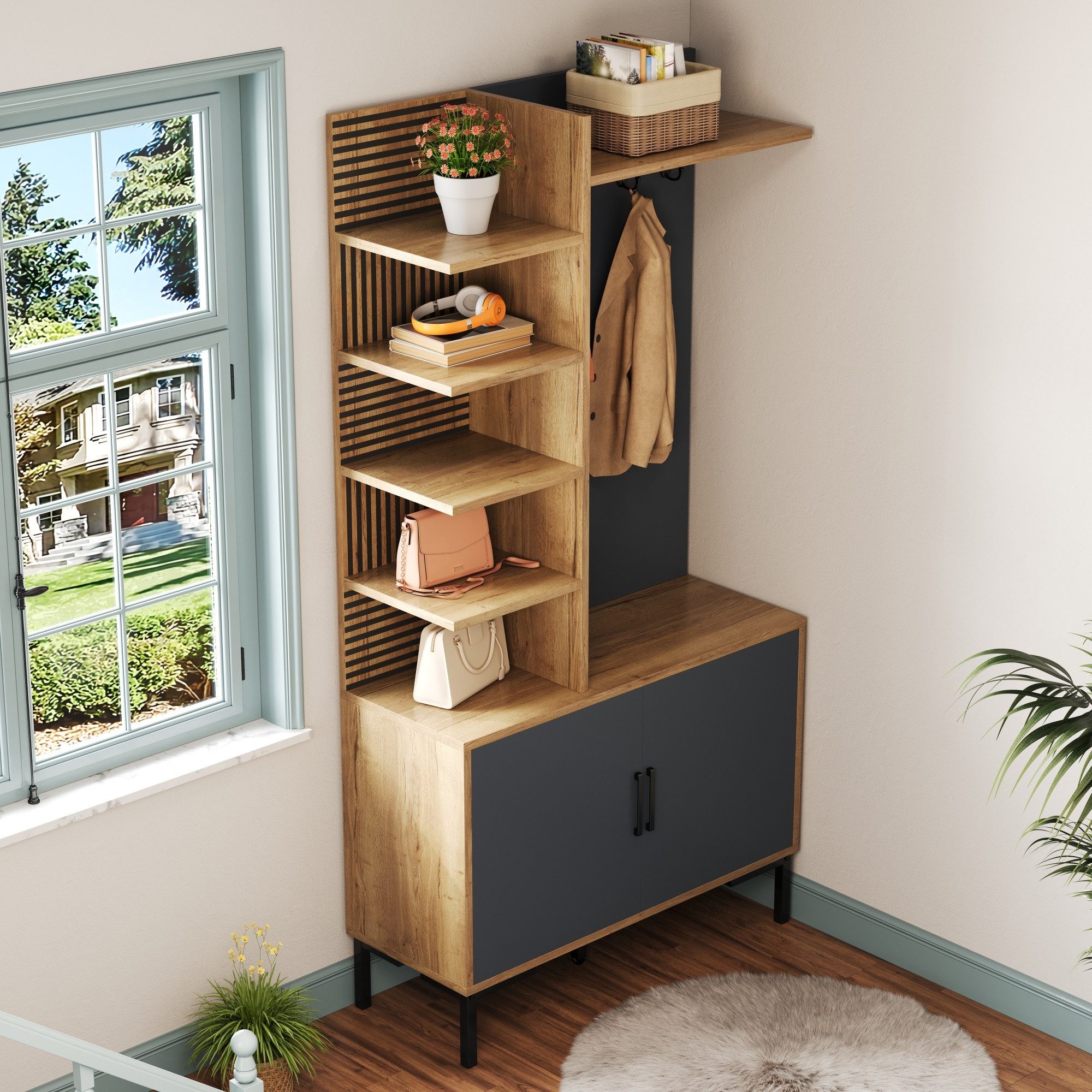 Für Stabilität und Langlebigkeit sorgen die starken Metallbeine, die gleichzeitig einen industriellen Touch ins Spiel bringen. Besonders praktisch sind die integrierten Haken, an denen Mäntel, Jacken oder Taschen ordentlich aufgehängt werden können. Das verstellbare untere Regal bietet flexible Aufbewahrungsmöglichkeiten für Schuhe oder Taschen in verschiedenen Größen.