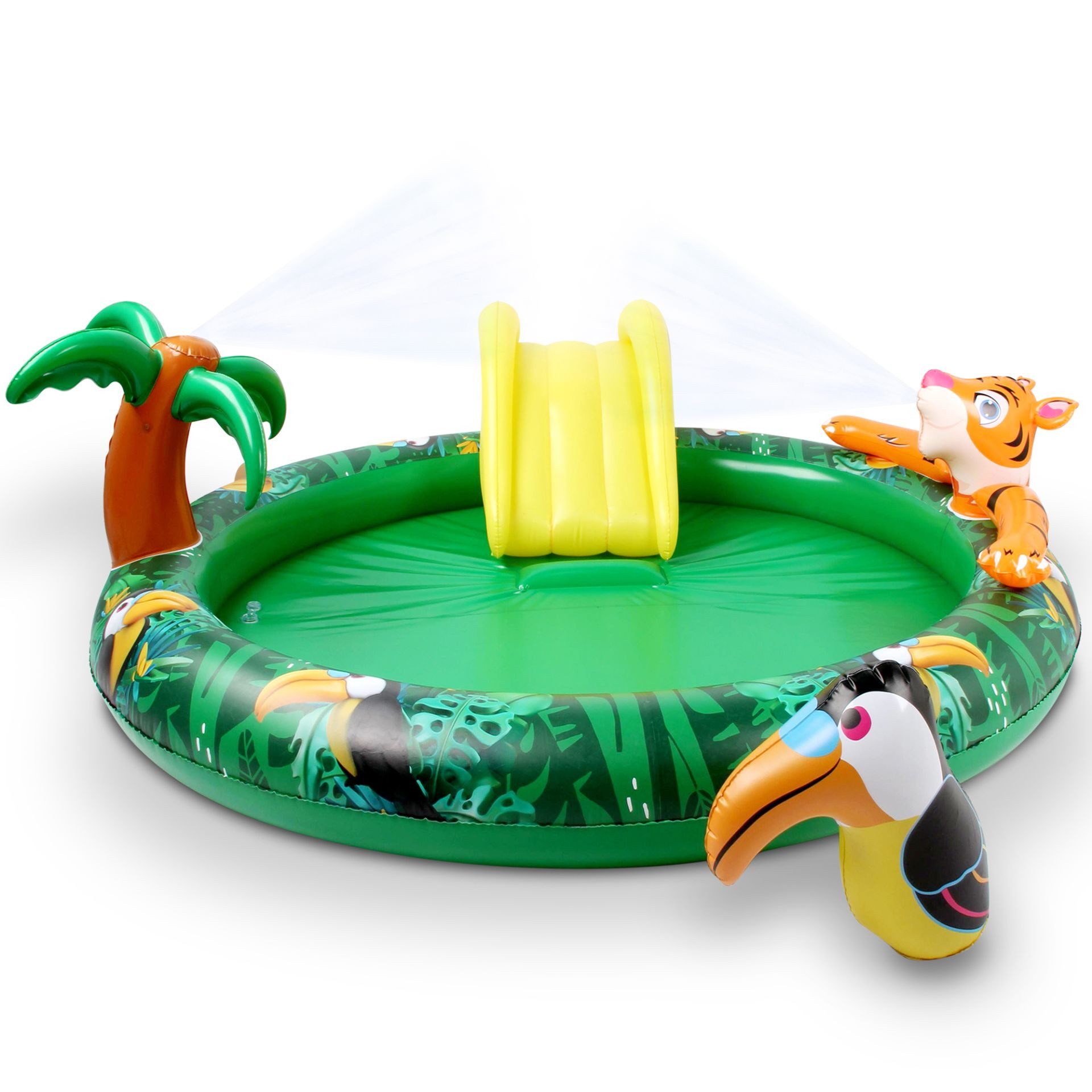 Mit dem ONBEST Planschbecken im Dschungel-Design verwandelt sich der Garten in ein tropisches Wasserabenteuer. Der aufblasbare Erlebnispool begeistert Kinder ab 3 Jahren mit integrierter Poolrutsche, lustigen Wasserspritzern in Palme und Tiger sowie einer tropischen Optik mit Papagei und buntem Blattwerk. Die großzügigen Maße von 182 x 62 x 165 cm bieten ausreichend Platz für Bewegung, Spiel und Badespaß.