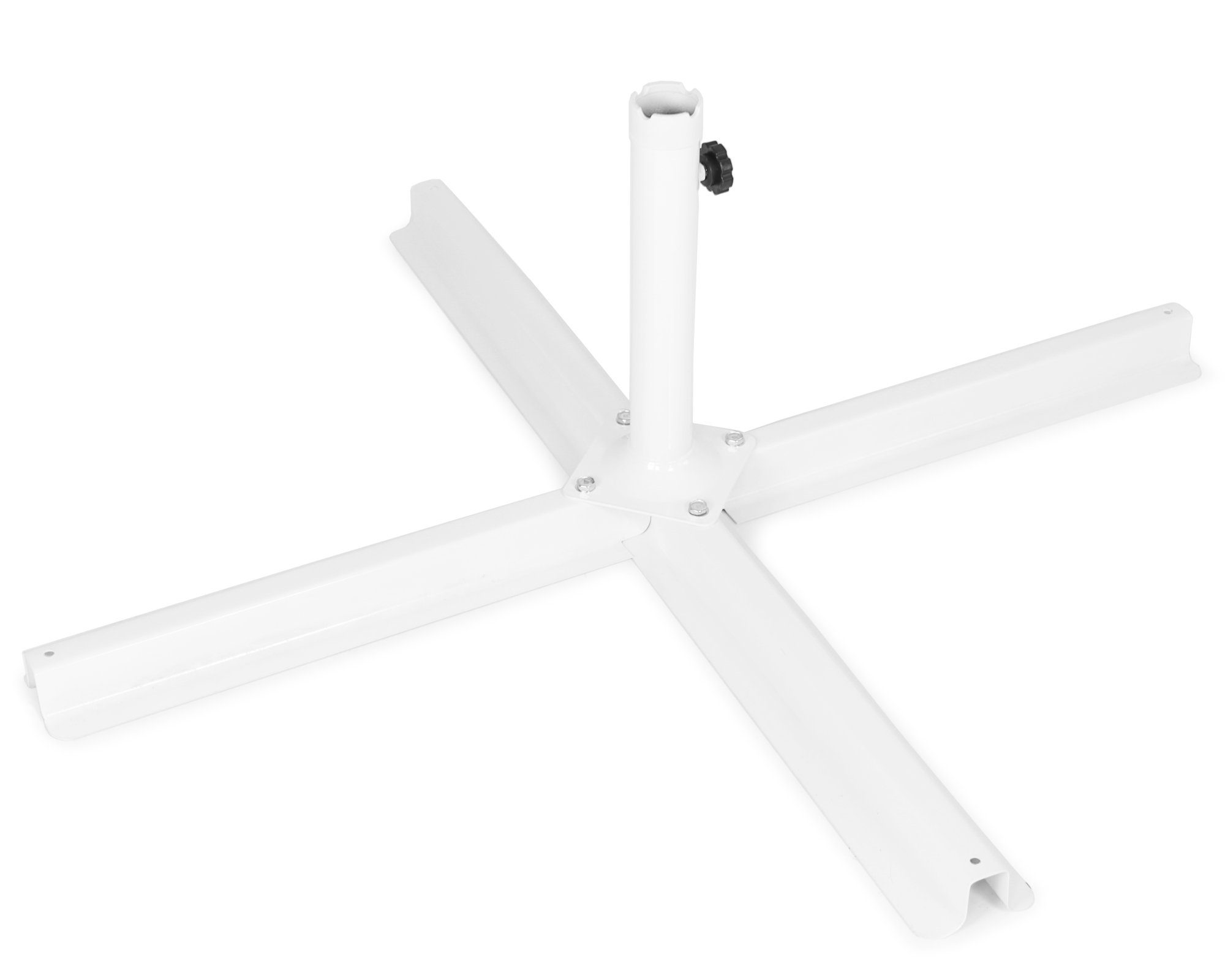 Da die Marktschirme nur über ein Standrohr ohne jegliche Befestigungsmöglichkeit verfügen, bieten wir Ihnen einen aus Stahl gefertigte Kreuzständer. Durch eine Druckschraube lassen sich unterschiedlich große Standrohre einfach festziehen. Zusätzlich wird die Stabilität durch eine Standfläche von 100 x 100 cm und einer Höhe von 30 cm verstärkt. Der Kreuzständer wiegt 3 kg und ist geeignet für Standrohre mit einem Durchmesser von 35 bis 43 mm. Gerade bei größeren Schirmen oder Ampelschirmen sollten Sie den Schirmständer darüber hinaus zusätzlich verankern. Die beste Standfestigkeit ist natürlich gegeben, wenn er fest mit dem Untergrund verschraubt wird. Die entsprechenden Löcher am Ende der Stützen sind natürlich vorhanden. Für Marktschirme der mittleren Размер genügt es meistens auch, passende Gewichte aufzulegen. Platten für unsere Kreuzständer finden Sie weiter unten im Zubehör.