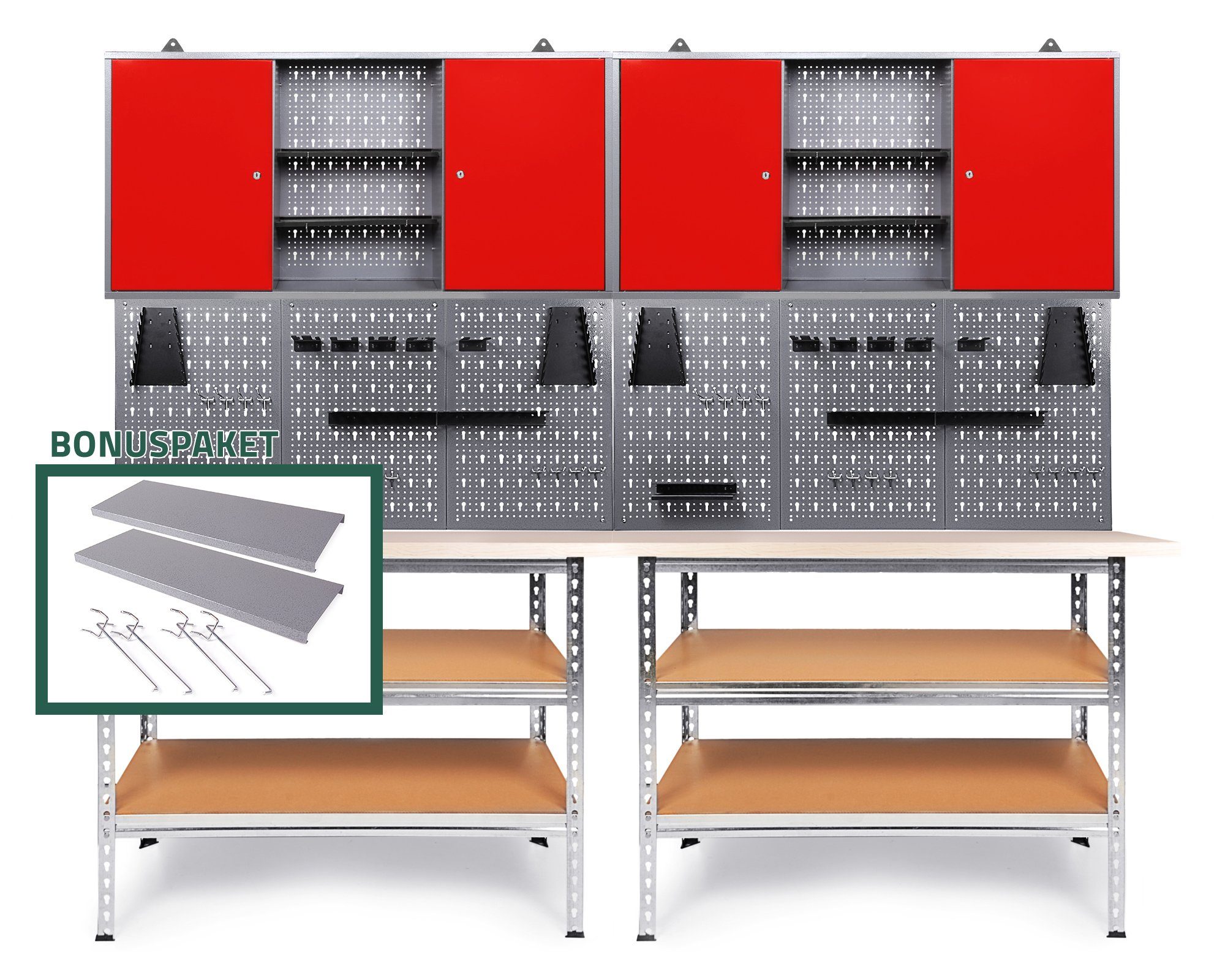 Werkstatteinrichtung 240 cm Uwe - Arbeitshöhe 92cm - bestehend aus 2 x Werkbank (Uwe), 2 x Werkstattschrank (120 cm), 6 x Lochwand, 2 x Lochwandhaken-Set