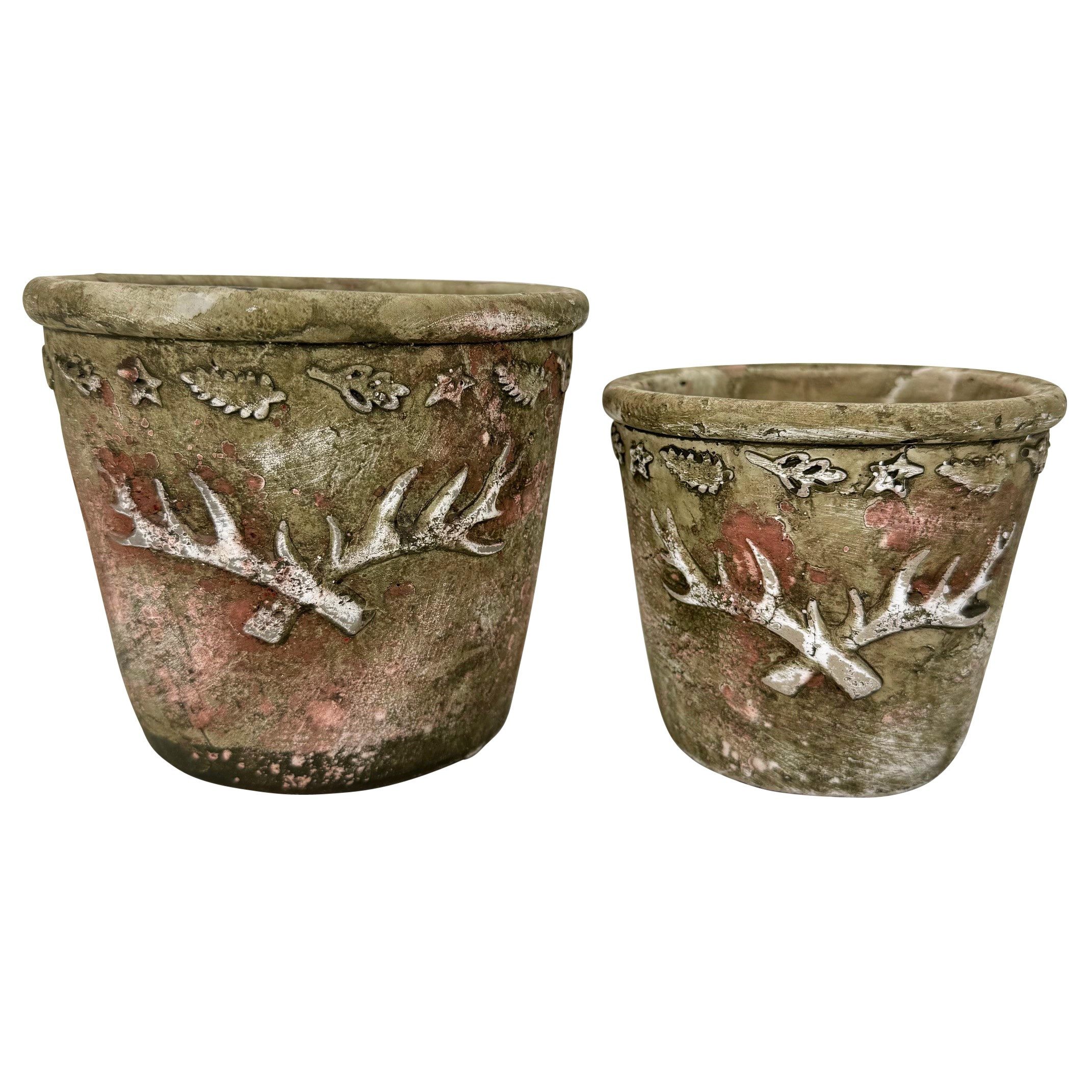 2 moderne Blumentöpfe, welche stark im used-look gehalten sind und durch Ihre Geweih und Blätter Applikationen hervorstechen.