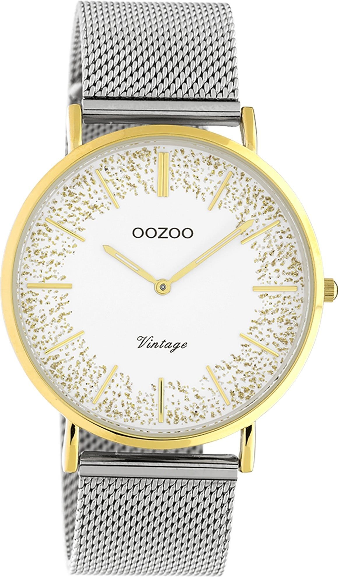 Die elegante Uhr der Marke Oozoo hat ein schönes Armband aus Edelstahl, in silber, mit Klappverschluss. Diese Uhr aus der Oozoo Vintage Kollektion für Damen besitzt ein goldfarbenes Gehäuse mit Quarzwerk. Die Analoguhr mit Mineralglas hat ein Ziffernblatt in weiß, mit zusätzlicher goldener Punktverzierung. Die Form der Uhr ist rund und das Gehäuse ist ca. 40mm groß.