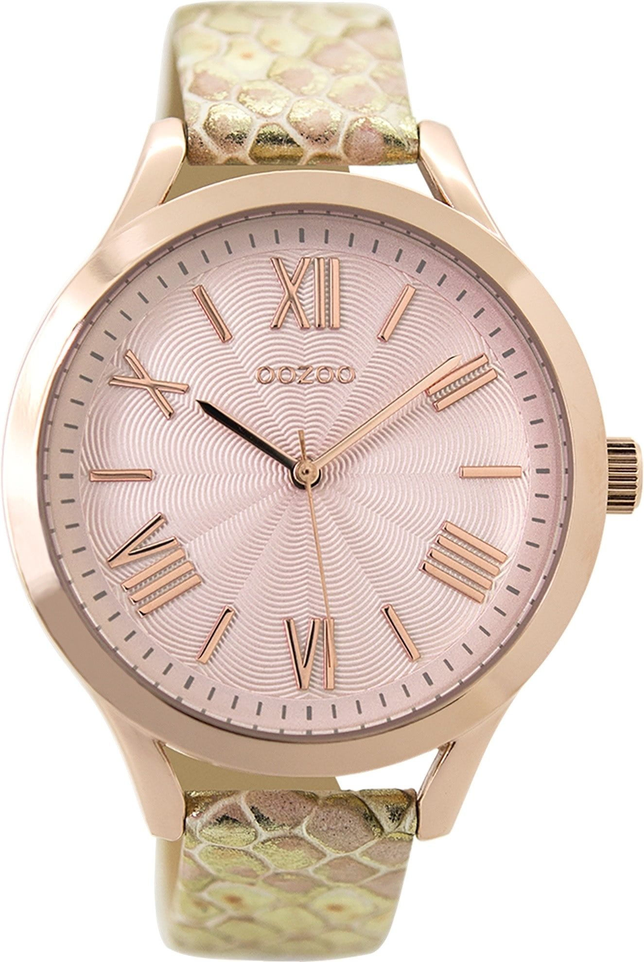 Die Casual Uhr der Marke Oozoo hat ein schönes Armband aus Leder in gold mit Dornschließe. Eine Uhr aus der Oozoo Timepieces Kollektion für Damen in der Gehäusefarbe rosegold mit Quarzwerk. Die Analoguhr mit Mineralglas hat ein Zifferblatt in der Farbe rosegold. Die Form der Uhr ist rund und das Gehäuse ist groß ca. 42mm.