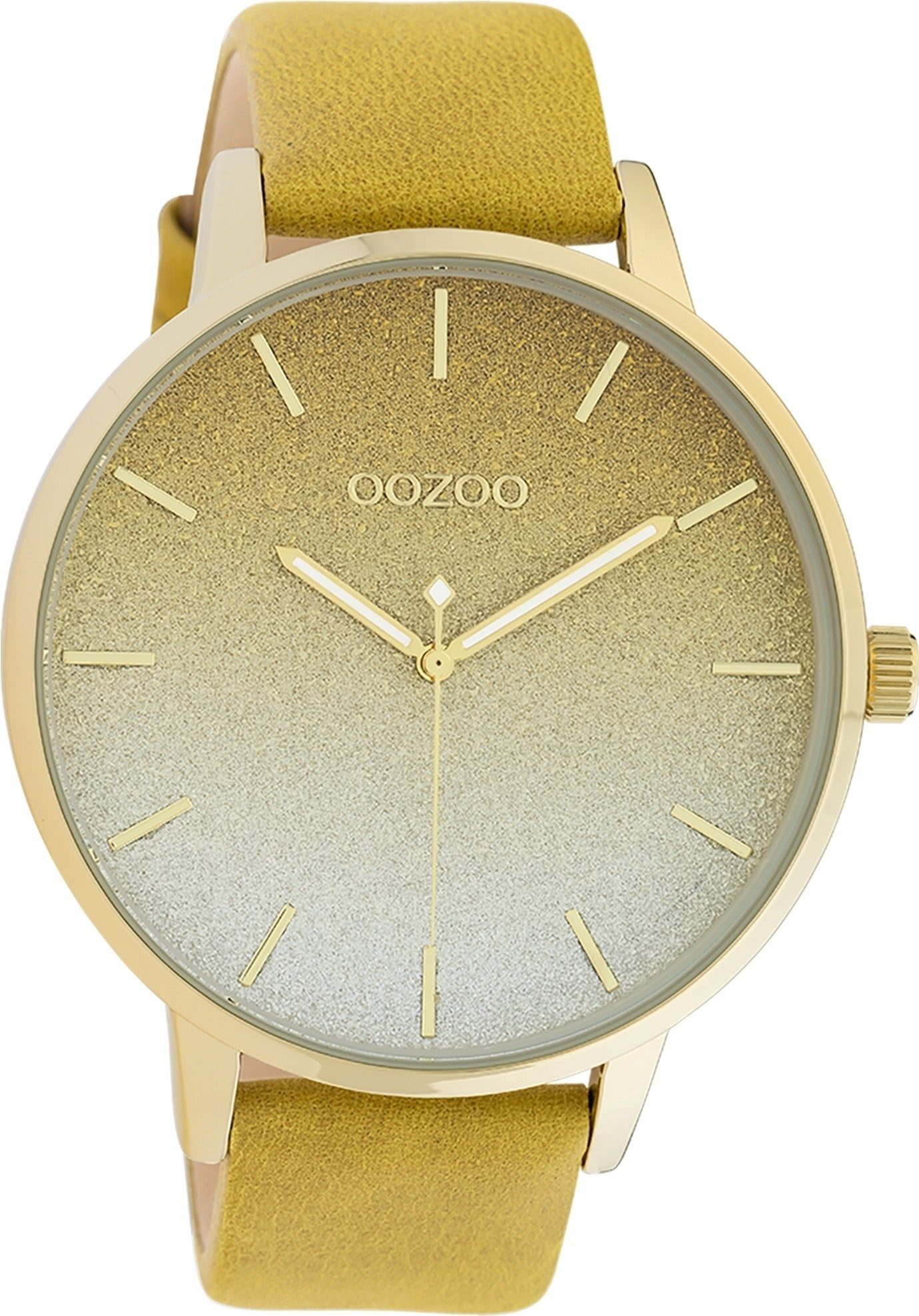 Die Fashion Uhr der Marke Oozoo hat ein schönes Armband aus Leder in gelb mit Dornschließe. Eine Uhr aus der Oozoo Timepieces Kollektion für Damen in der Gehäusefarbe gold mit Quarzwerk. Die Analoguhr mit Mineralglas hat ein Zifferblatt in der Farbe gelb weiß. Die Form der Uhr ist rund und das Gehäuse ist extra groß ca. 48mm.