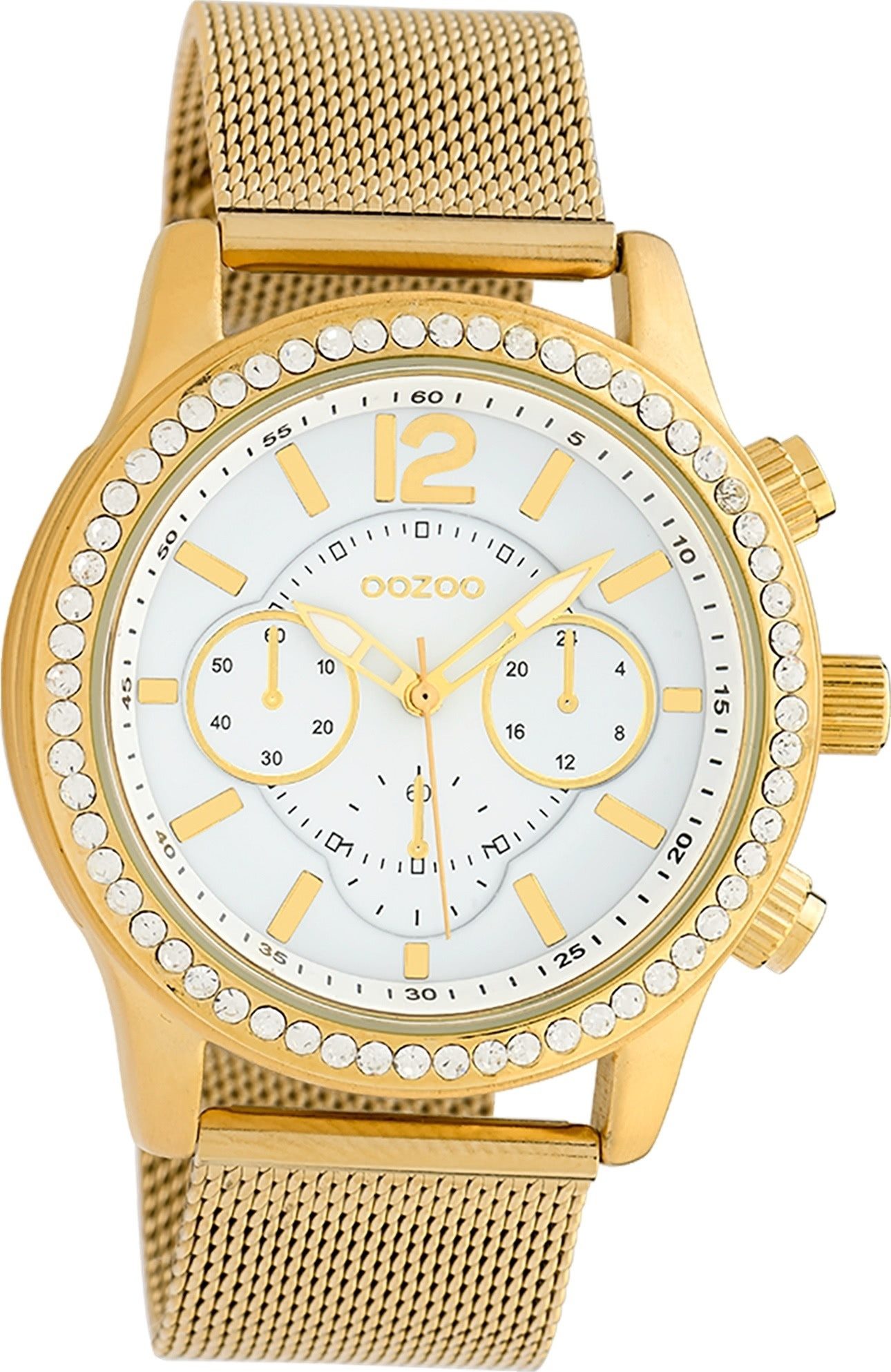 Die Fashion Uhr der Marke Oozoo hat ein schönes Armband aus Metall in gold mit Schiebeverschluss. Eine Uhr aus der Oozoo Timepieces Kollektion für Damen in der Gehäusefarbe gold mit Quarzwerk. Die Analoguhr mit Mineralglas hat ein Zifferblatt in der Farbe weiß. Die Form der Uhr ist rund und das Gehäuse ist groß ca. 40mm.