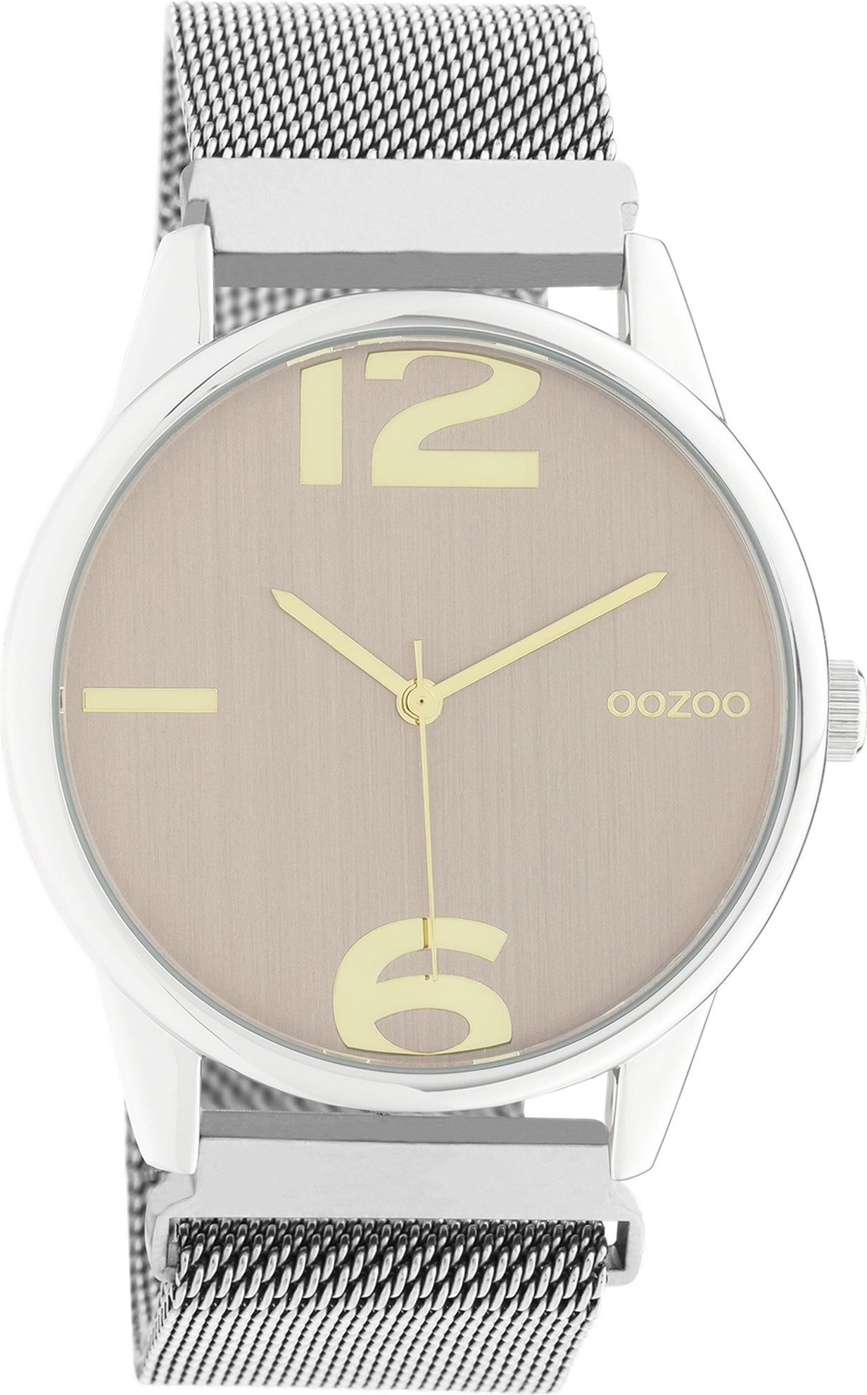 Die Fashion Uhr der Marke Oozoo hat ein schönes Armband aus Metall in silber mit Schiebeverschluss. Eine Uhr aus der Oozoo Timepieces Kollektion für Damen in der Gehäusefarbe silber mit Quarzwerk. Die Analoguhr mit Mineralglas hat ein Zifferblatt in der Farbe beige rosa. Die Form der Uhr ist rund und das Gehäuse ist groß ca. 40mm.