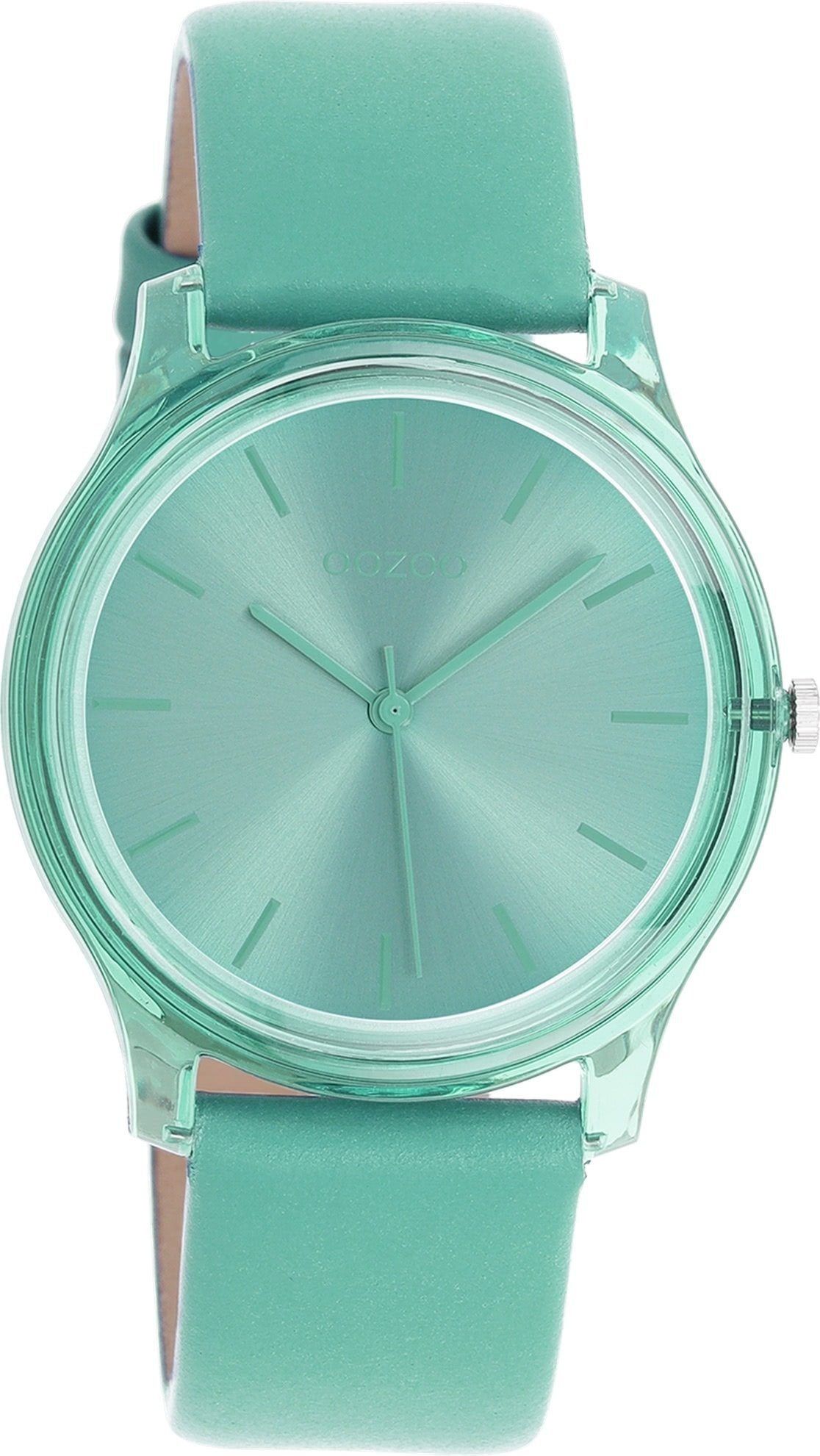 Die Casual Uhr der Marke Oozoo hat ein schönes Armband aus Leder in grün mit Dornschließe. Eine Uhr aus der Oozoo Timepieces Kollektion für Damen in der Gehäusefarbe grün mit Quarzwerk. Die Analoguhr mit Mineralglas hat ein Zifferblatt in der Farbe grün. Die Form der Uhr ist rund und das Gehäuse ist mittel ca. 36mm.