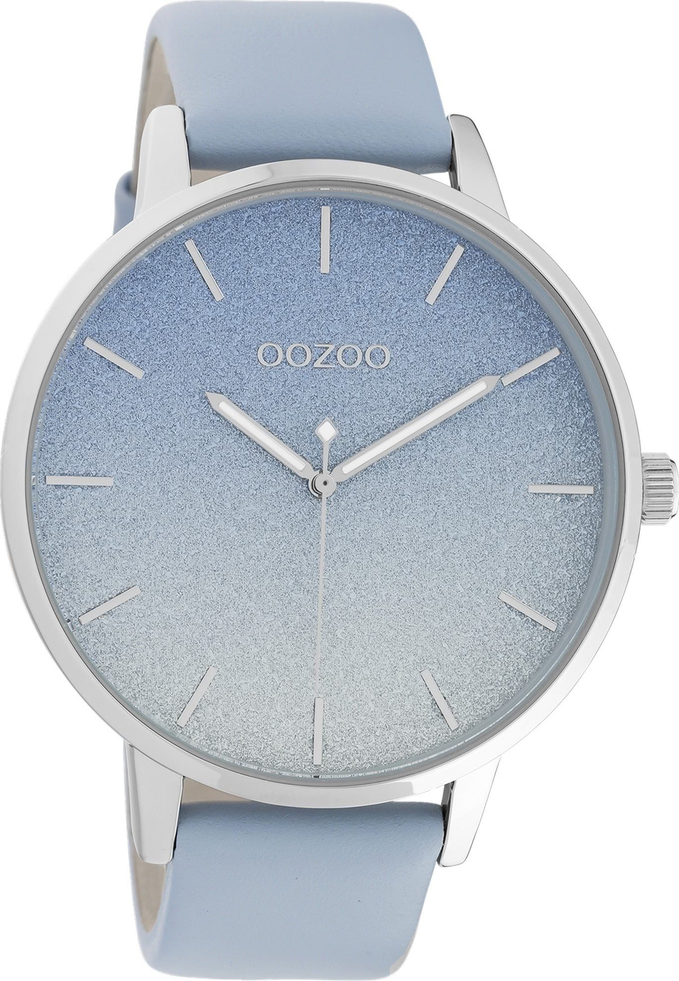 Die Fashion Uhr der Marke Oozoo hat ein schönes Armband aus Leder in hellblau mit Dornschließe. Eine Uhr aus der Oozoo Timepieces Kollektion für Damen in der Gehäusefarbe silber mit Quarzwerk. Die Analoguhr mit Mineralglas hat ein Zifferblatt in der Farbe hellblau/silber. Die Form der Uhr ist rund und das Gehäuse ist extra groß ca. 48mm.