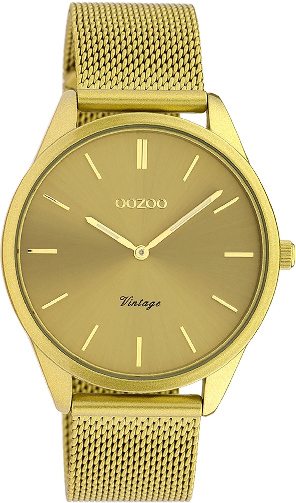 Die Fashion Uhr der Marke Oozoo hat ein schönes Armband aus Edelstahl in gelb mustard mit Klappverschluss. Eine Uhr aus der Oozoo Vintage Series Kollektion für Damen in der Gehäusefarbe goldfarben mit Quarzwerk. Die Analoguhr mit Mineralglas hat ein Zifferblatt in der Farbe gelb mustard. Die Form der Uhr ist rund und das Gehäuse ist mittel ca. 38mm.