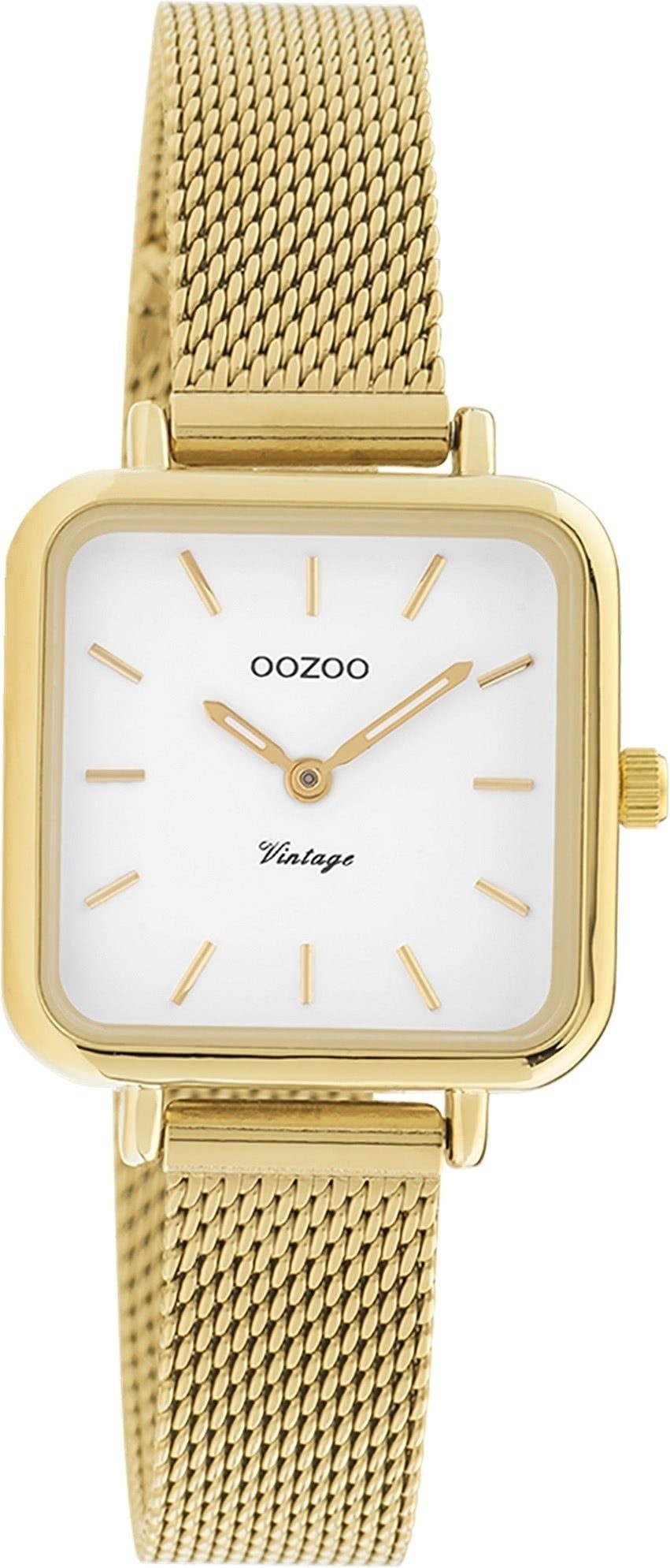 Die Casual Uhr der Marke Oozoo hat ein schönes Armband aus Metall Mesh in gold mit Schiebeverschluss. Eine Uhr aus der Oozoo Vintage Series Kollektion für Damen in der Gehäusefarbe gold mit Quarzwerk. Die Analoguhr mit Mineralglas hat ein Zifferblatt in der Farbe weiß. Die Form der Uhr ist rechteckig und das Gehäuse ist extra groß ca. 26x26mm.
