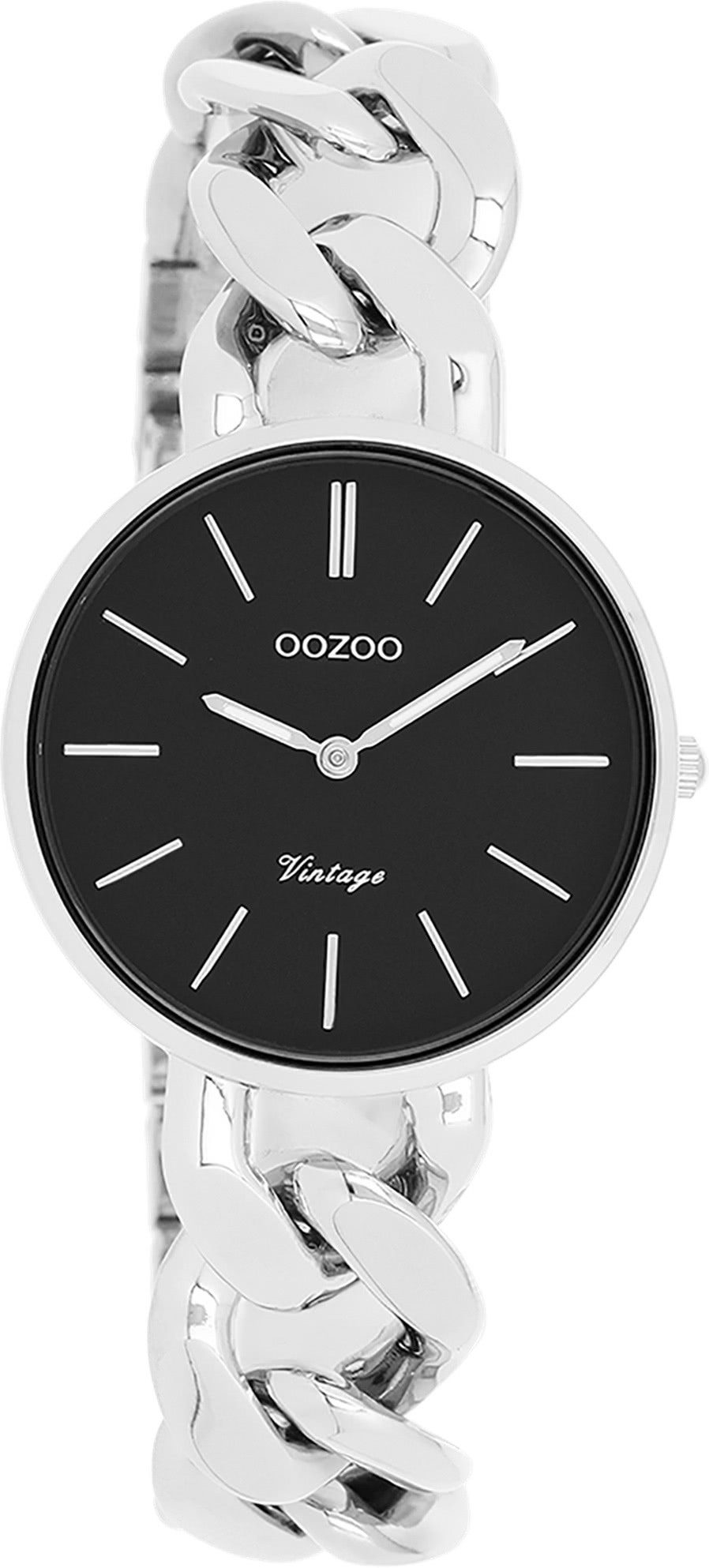 Die Fashion Uhr der Marke Oozoo hat ein schönes Armband aus Metall in silber mit Schiebeverschluss. Eine Uhr aus der Oozoo Vintage Series Kollektion für Damen in der Gehäusefarbe silber mit Quarzwerk. Die Analoguhr mit Mineralglas hat ein Zifferblatt in der Farbe schwarz. Die Form der Uhr ist rund und das Gehäuse ist mittel ca. 32mm.