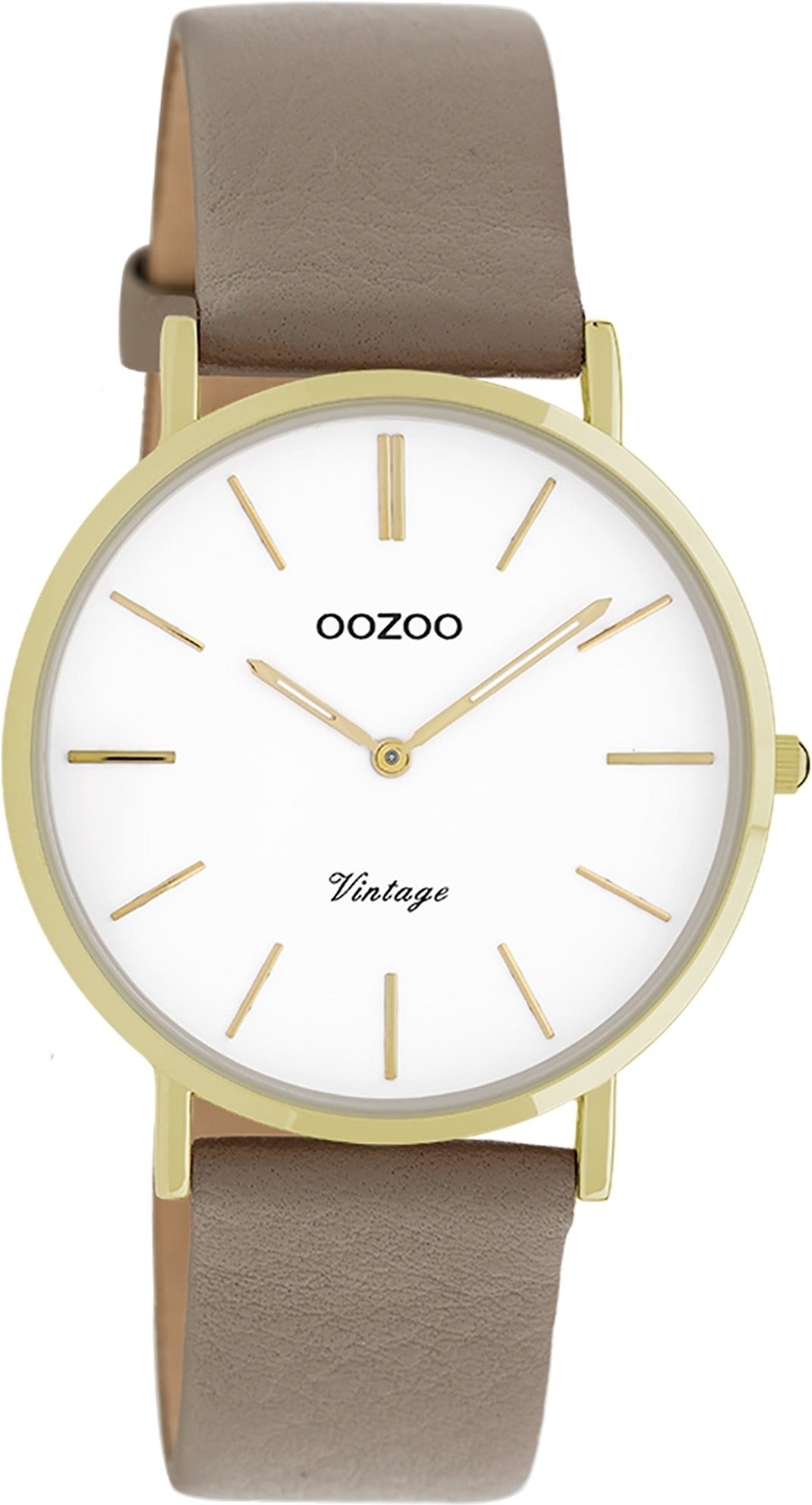 Die Fashion Uhr der Marke Oozoo hat ein schönes Armband aus Leder in taupe braun mit Dornschließe. Eine Uhr aus der Oozoo Vintage Series Kollektion für Damen in der Gehäusefarbe gold mit Quarzwerk. Die Analoguhr mit Mineralglas hat ein Zifferblatt in der Farbe weiß. Die Form der Uhr ist rund und das Gehäuse ist mittel ca. 36mm.