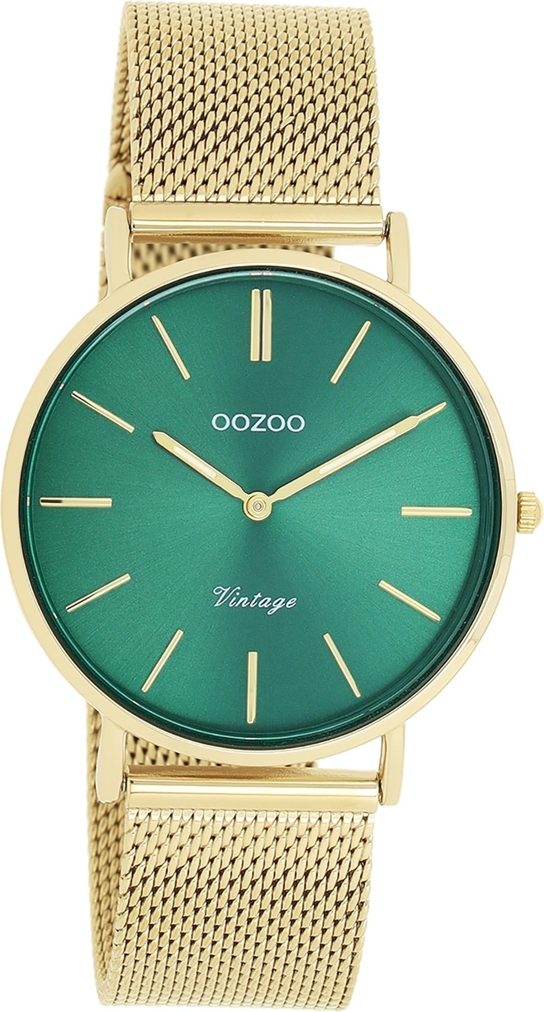 Die Casual Uhr der Marke Oozoo hat ein schönes Armband aus Metall Mesh in gold mit Schiebeverschluss. Eine Uhr aus der Oozoo Vintage Series Kollektion für Damen in der Gehäusefarbe gold mit Quarzwerk. Die Analoguhr mit Mineralglas hat ein Zifferblatt in der Farbe grün. Die Form der Uhr ist rund und das Gehäuse ist mittel ca. 36mm.