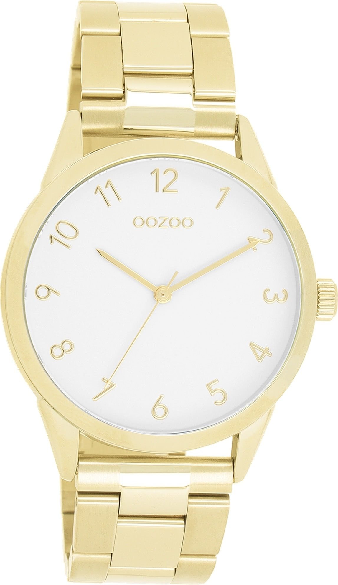 Die Elegant Uhr der Marke Oozoo hat ein schönes Armband aus Edelstahl stainless steel in gold mit Dornschließe. Eine Uhr aus der Oozoo Timepieces Kollektion für Damen Herren in der Gehäusefarbe gold mit Quarzwerk. Die Analoguhr mit Mineralglas hat ein Zifferblatt in der Farbe weiß. Die Form der Uhr ist rund und das Gehäuse ist groß ca. 40mm.