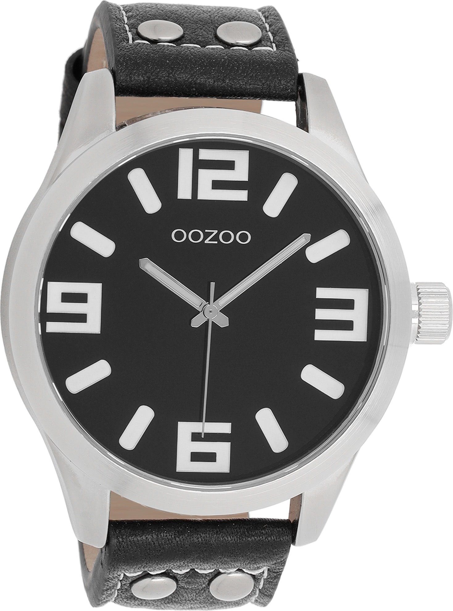 Die Fashion Uhr der Marke Oozoo hat ein schönes Armband aus Leder in schwarz silber mit Dornschließe. Eine Uhr aus der Oozoo Timepieces Kollektion für Herren Damen in der Gehäusefarbe silber mit Quarzwerk. Die Analoguhr mit Mineralglas hat ein Zifferblatt in der Farbe schwarz. Die Form der Uhr ist rund und das Gehäuse ist extra groß ca. 51mm.