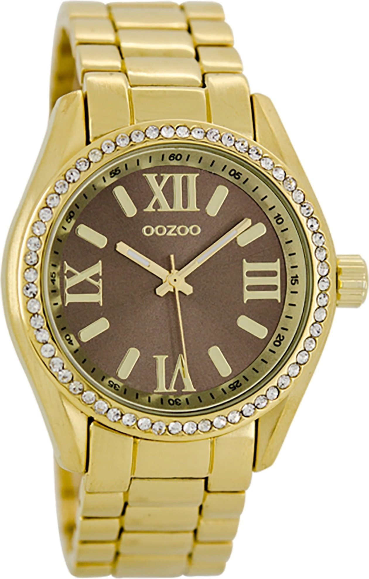 Die Fashion Uhr der Marke Oozoo hat ein schönes Armband aus Metall in gold mit Schiebeverschluss. Eine Uhr aus der Oozoo Vintage Series Kollektion für Damen Herren in der Gehäusefarbe gold mit Quarzwerk. Die Analoguhr mit Mineralglas hat ein Zifferblatt in der Farbe braun. Die Form der Uhr ist rund und das Gehäuse ist groß ca. 40mm.