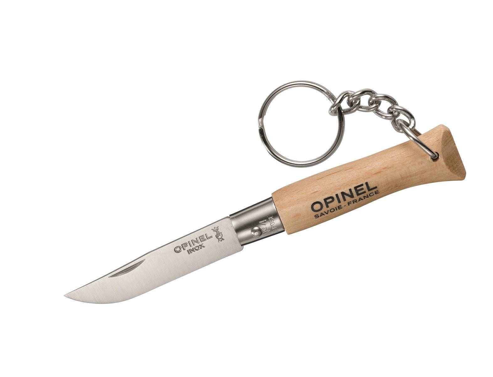 Opinel Mini-Messer mit rostfreier Klinge und einem Heft aus lackiertem Hartholz. Das Messer der Размер 4 ist zusätzlich mit einem praktischen Schlüsselanhänger versehen.
