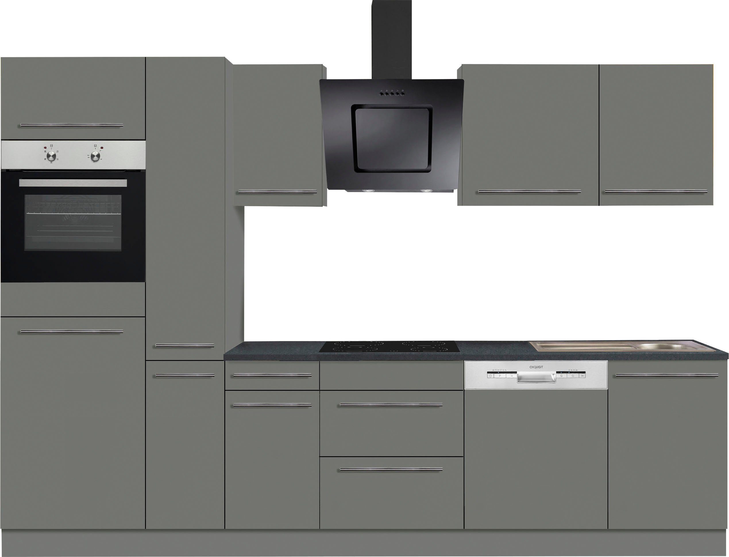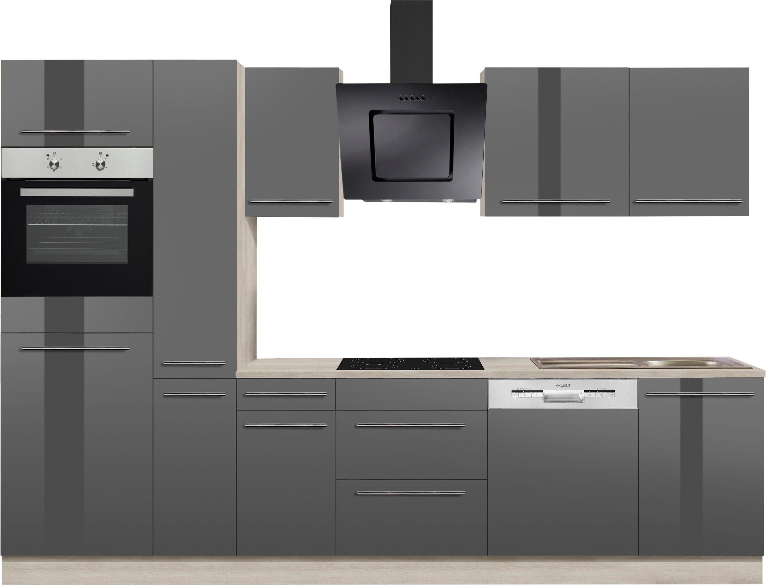 Ausstattung | Durchgehende Arbeitsplatte Einlegeböden höhenverstellbar Höhenverstellbare Füße Schubkästen und Türen mit Soft-Close-Funktion inkl. Edelstahl-Einbauspüle, mit Abtropffläche |