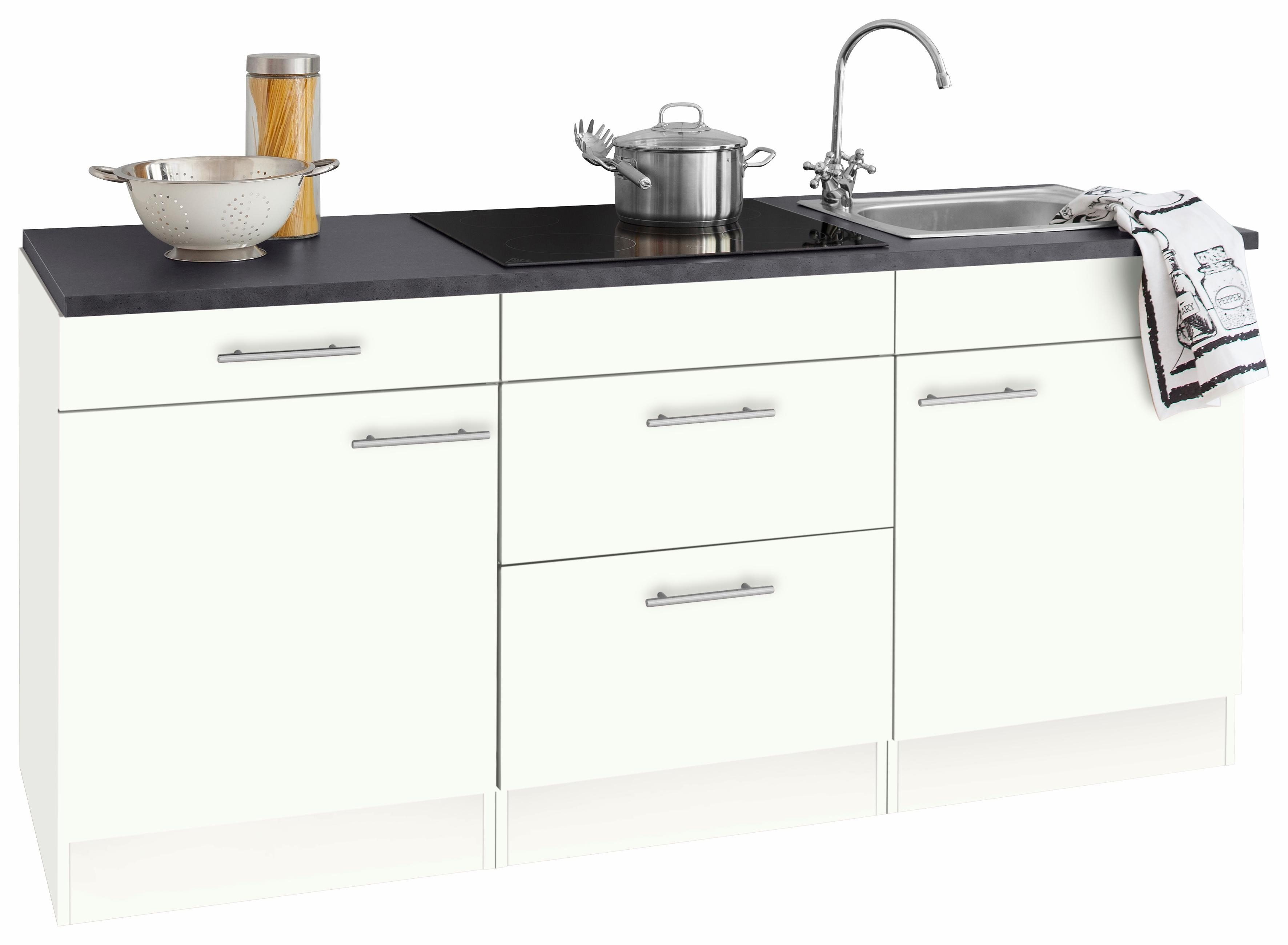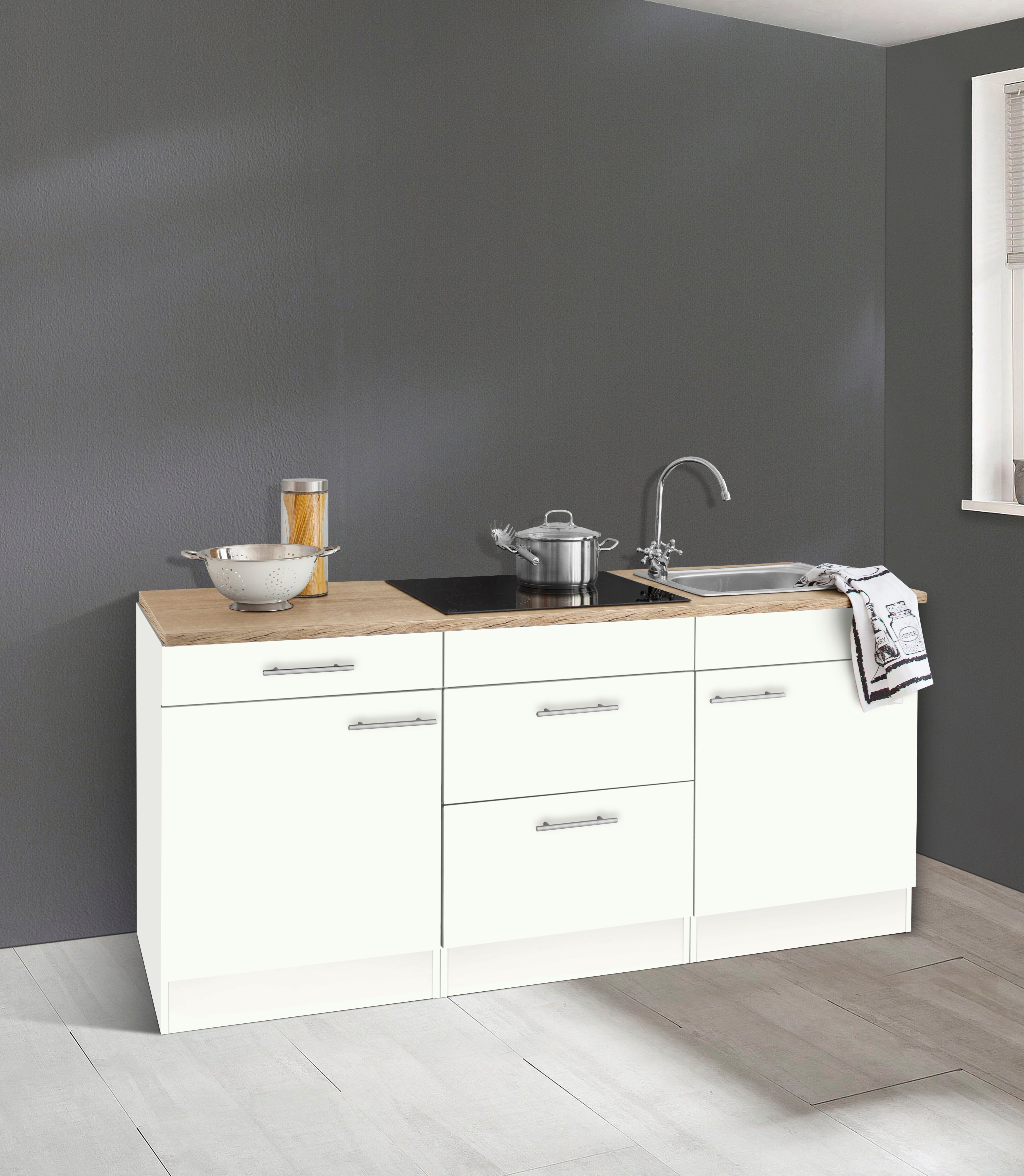 Ausstattung | Durchgehende Arbeitsplatte Laufleisten der Schubkästen aus Metall Seitenverkehrt stellbar Sockelhöhe nicht verstellbar inkl. Edelstahl-Einbauspüle, ohne Abtropffläche |