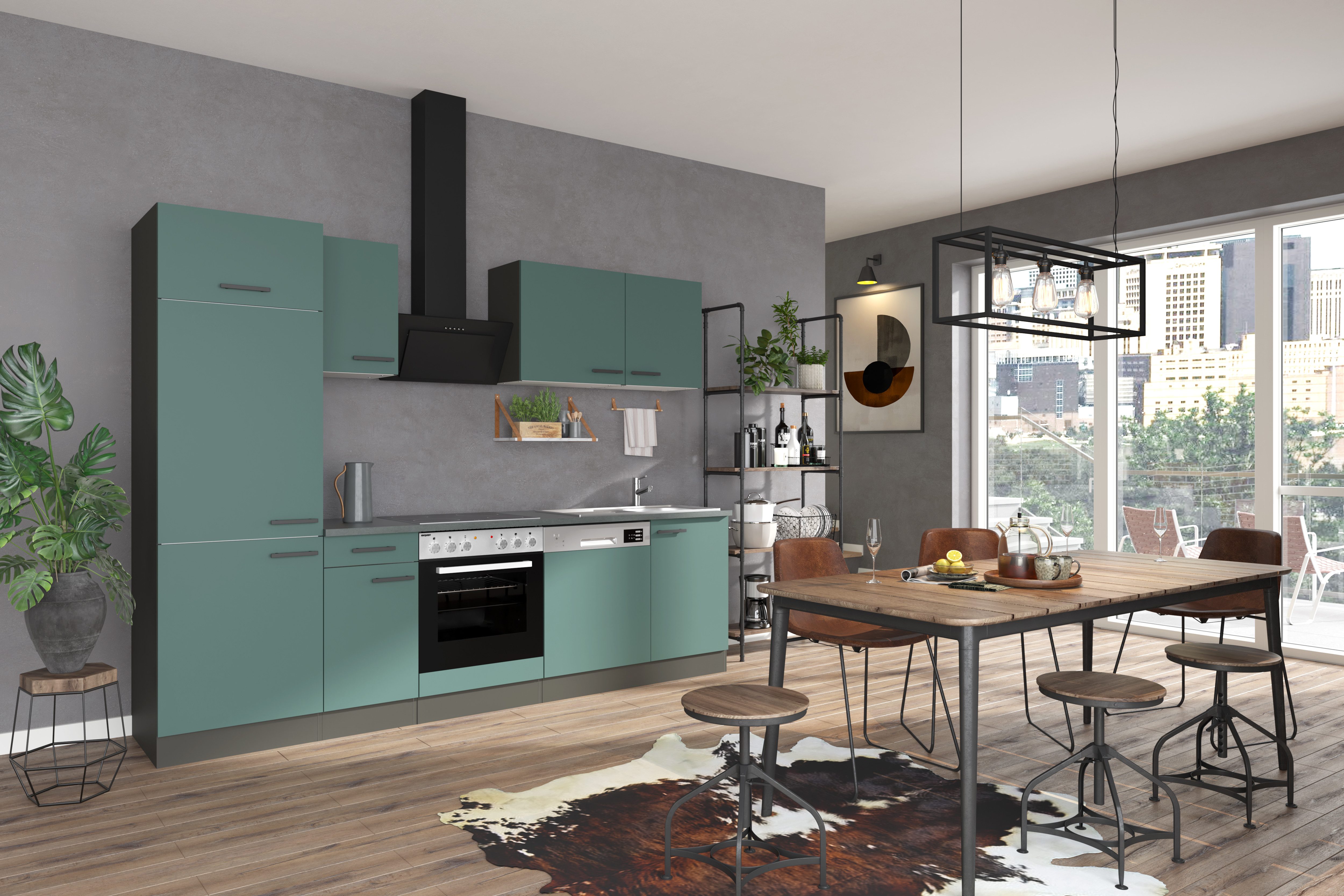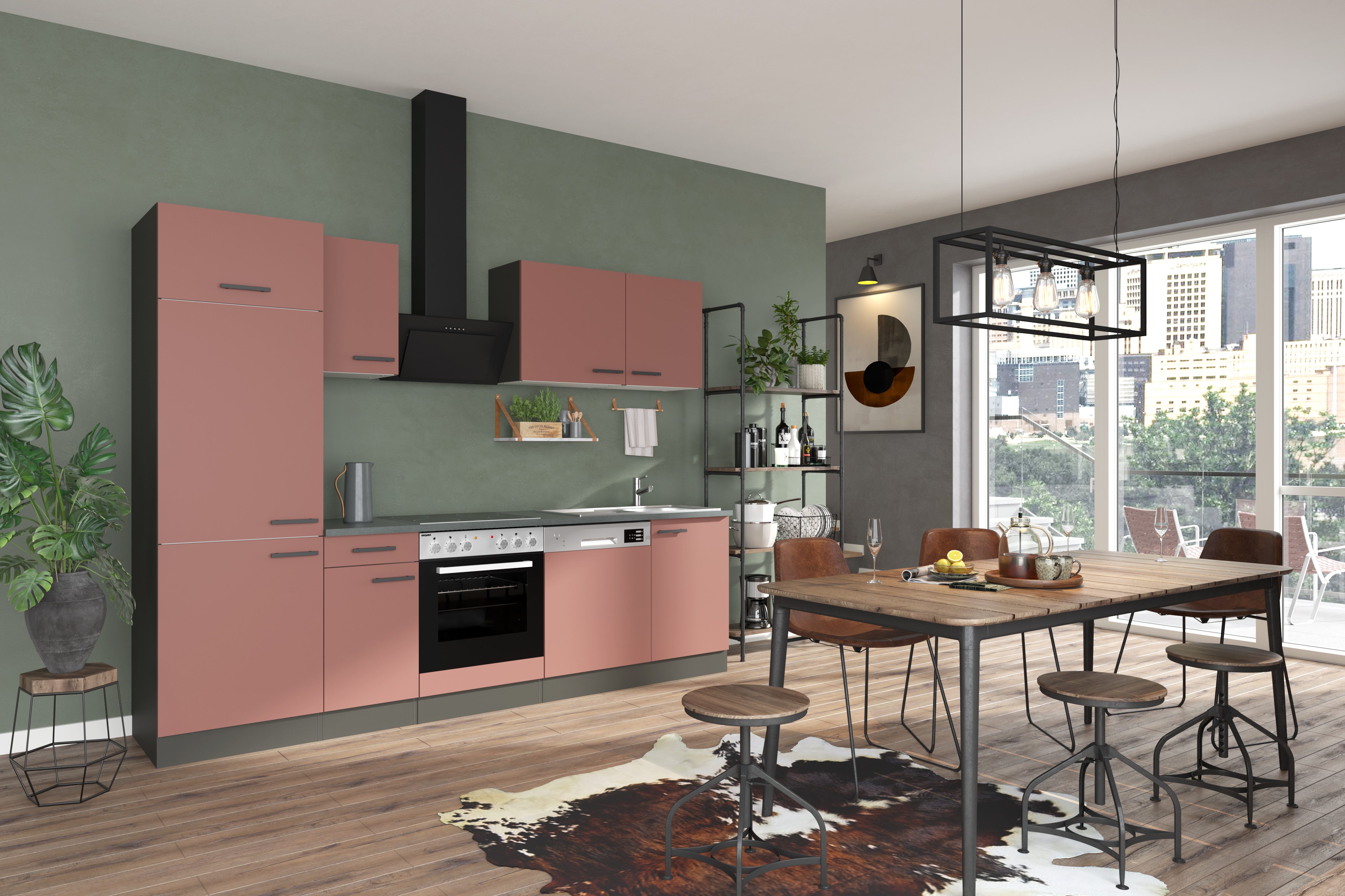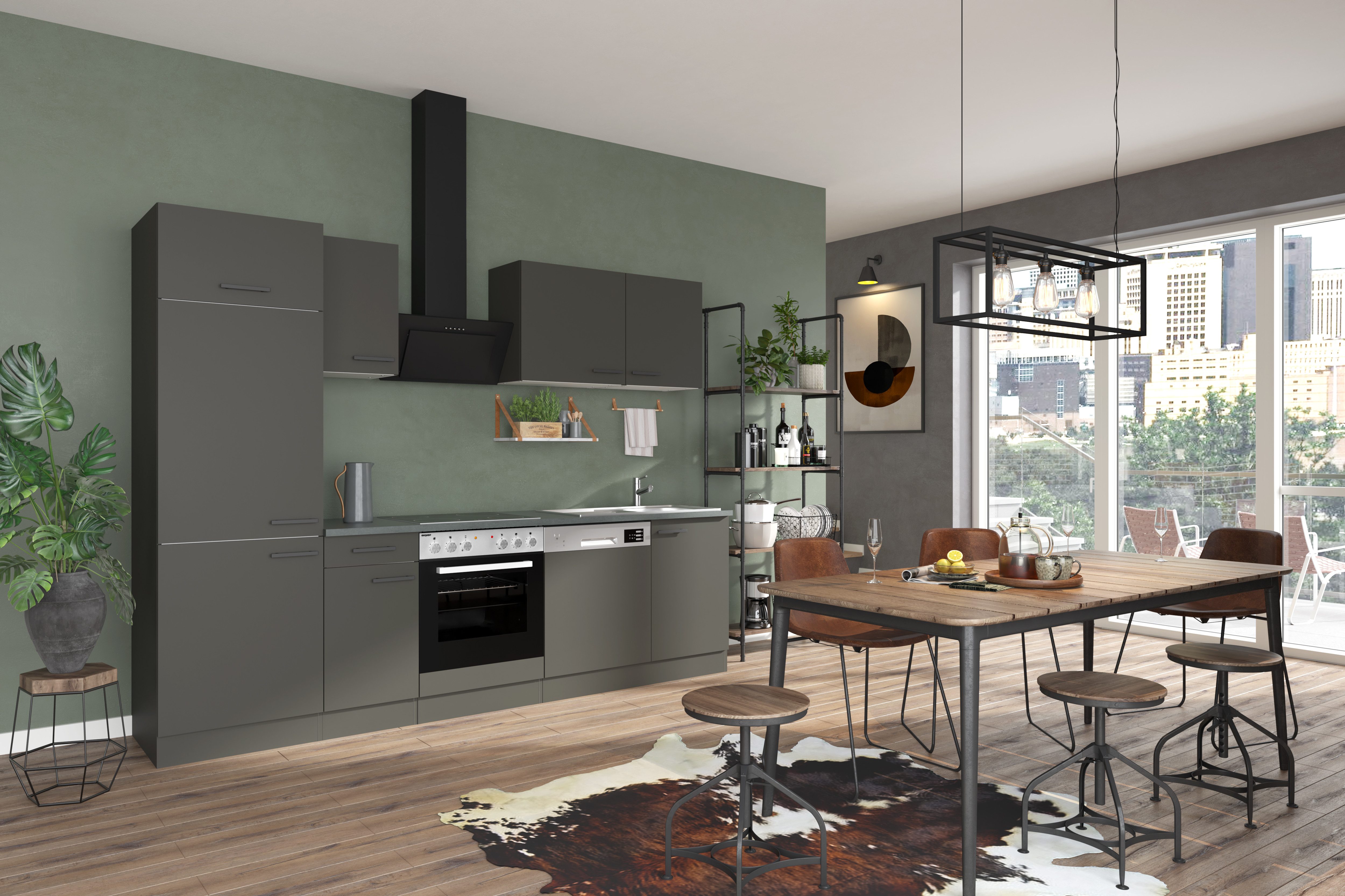 Ausstattung | Durchgehende Arbeitsplatte Einlegeböden höhenverstellbar Laufleisten der Schubkästen aus Metall Metallgriffe Seitenverkehrt stellbar Sockelhöhe nicht verstellbar Türen wahlweise rechts/links montierbar inkl. Edelstahl-Einbauspüle, mit Abtropffläche |
