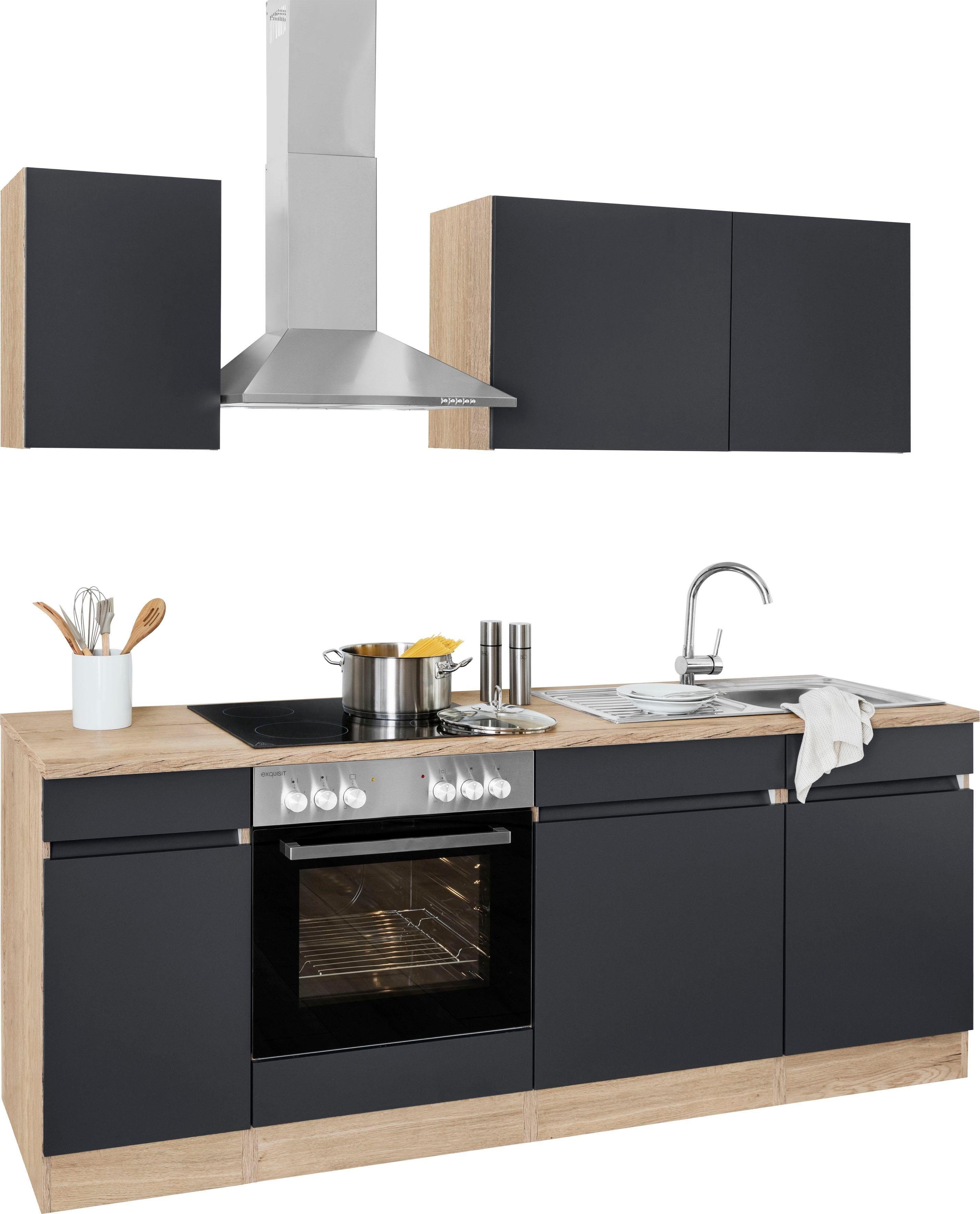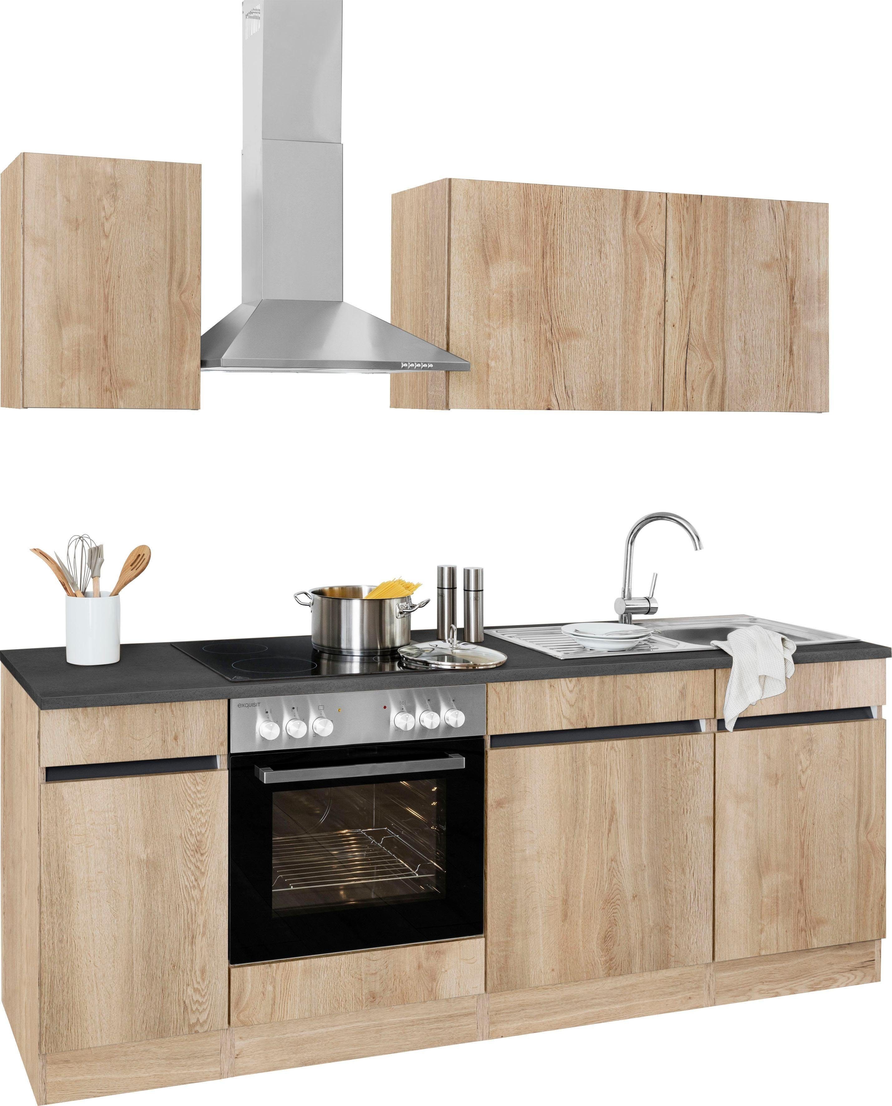 Ausstattung | Durchgehende Arbeitsplatte Einlegeböden höhenverstellbar Grifflose Optik Türen wahlweise rechts/links montierbar inkl. Edelstahl-Einbauspüle, mit Abtropffläche |