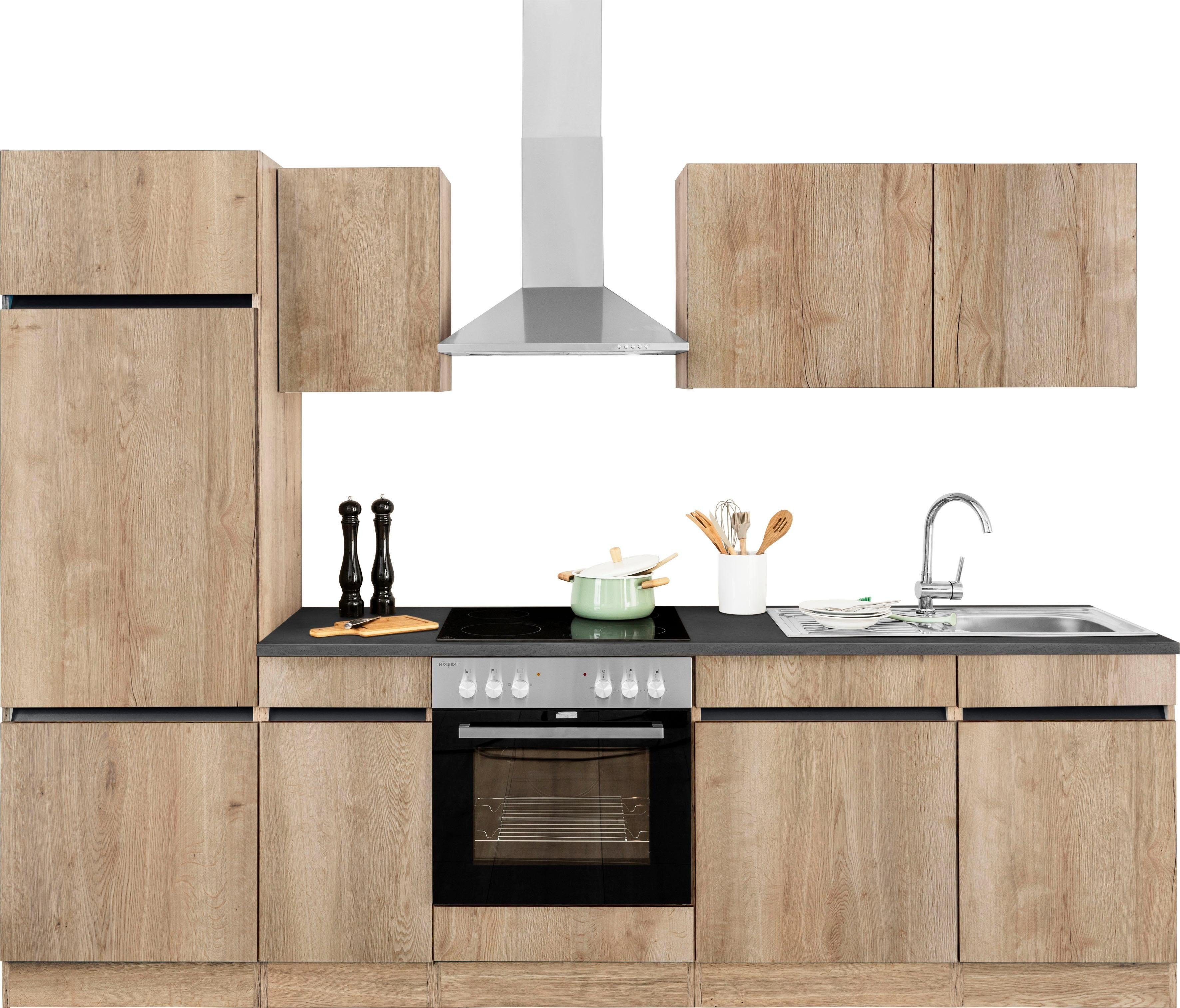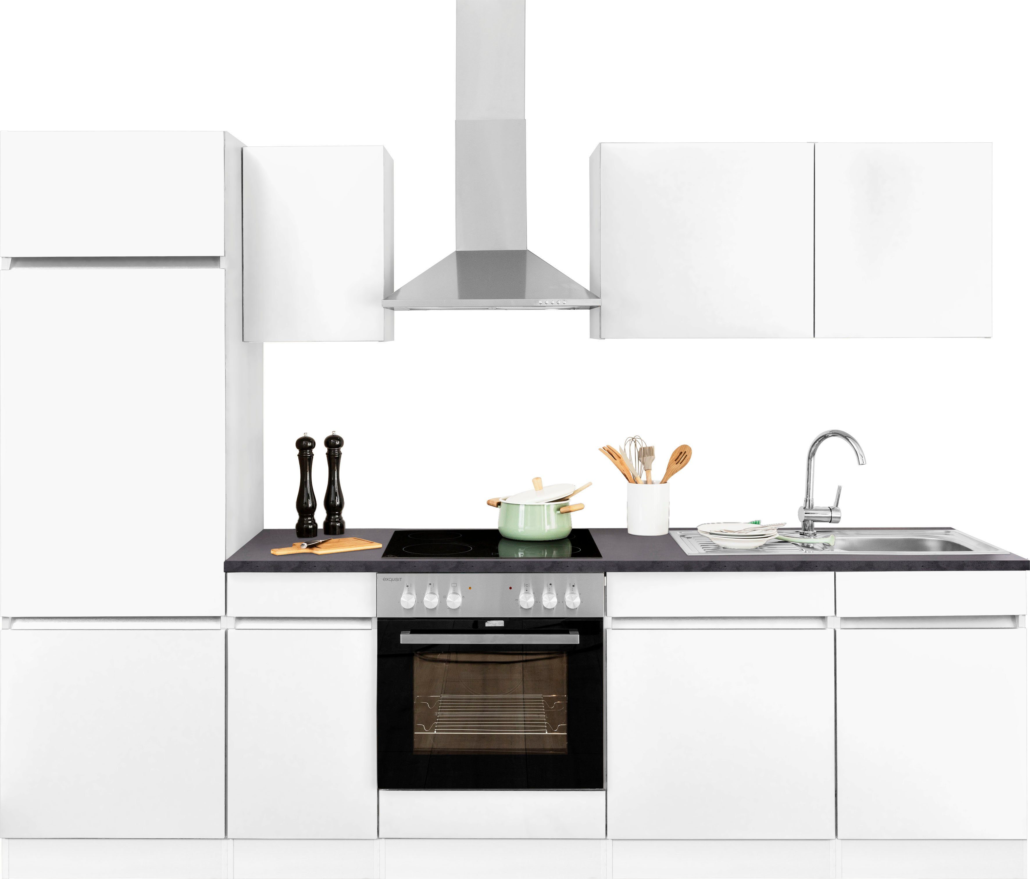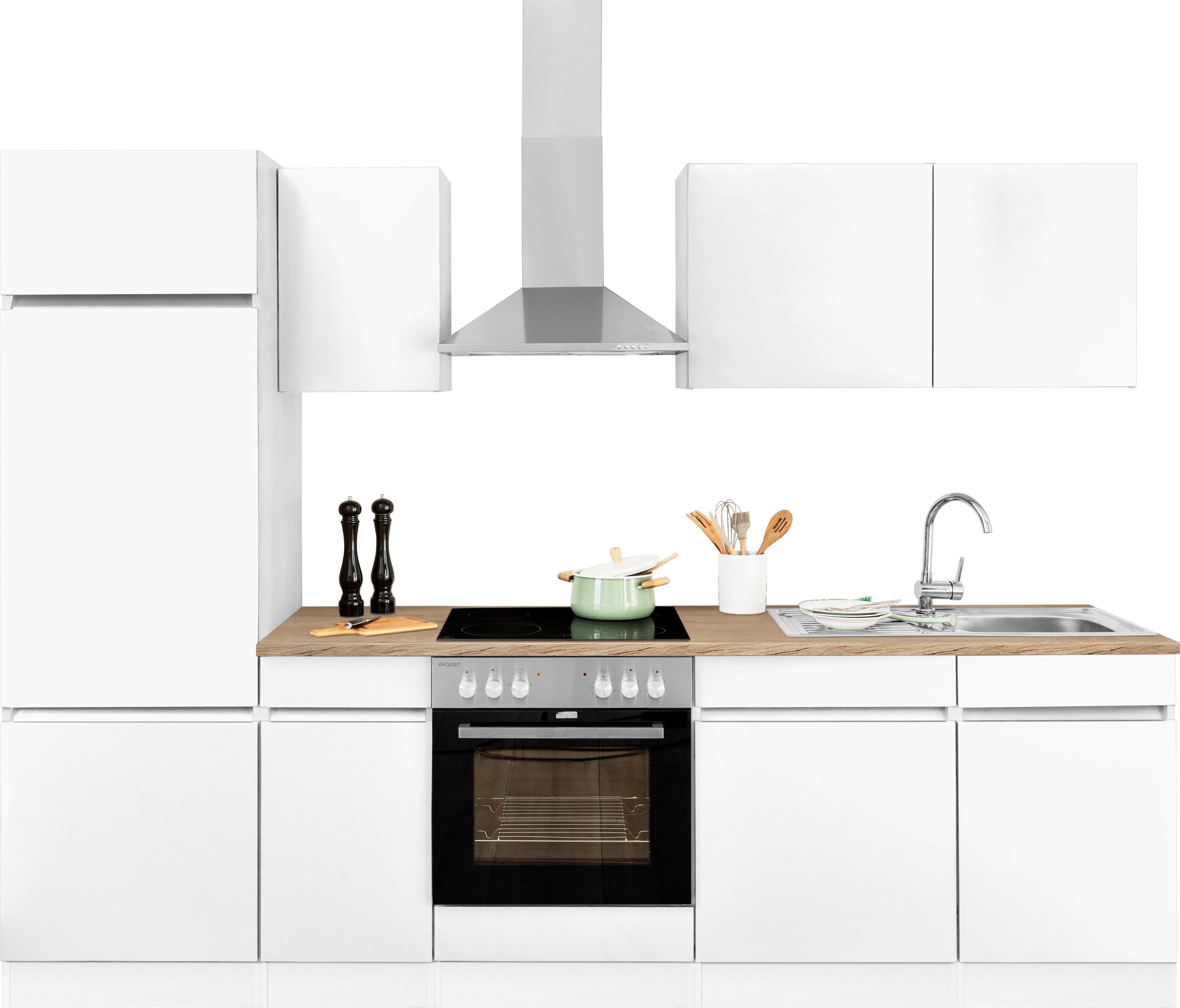 Ausstattung | Durchgehende Arbeitsplatte Einlegeböden höhenverstellbar Grifflose Optik Seitenverkehrt stellbar inkl. Edelstahl-Einbauspüle, mit Abtropffläche |