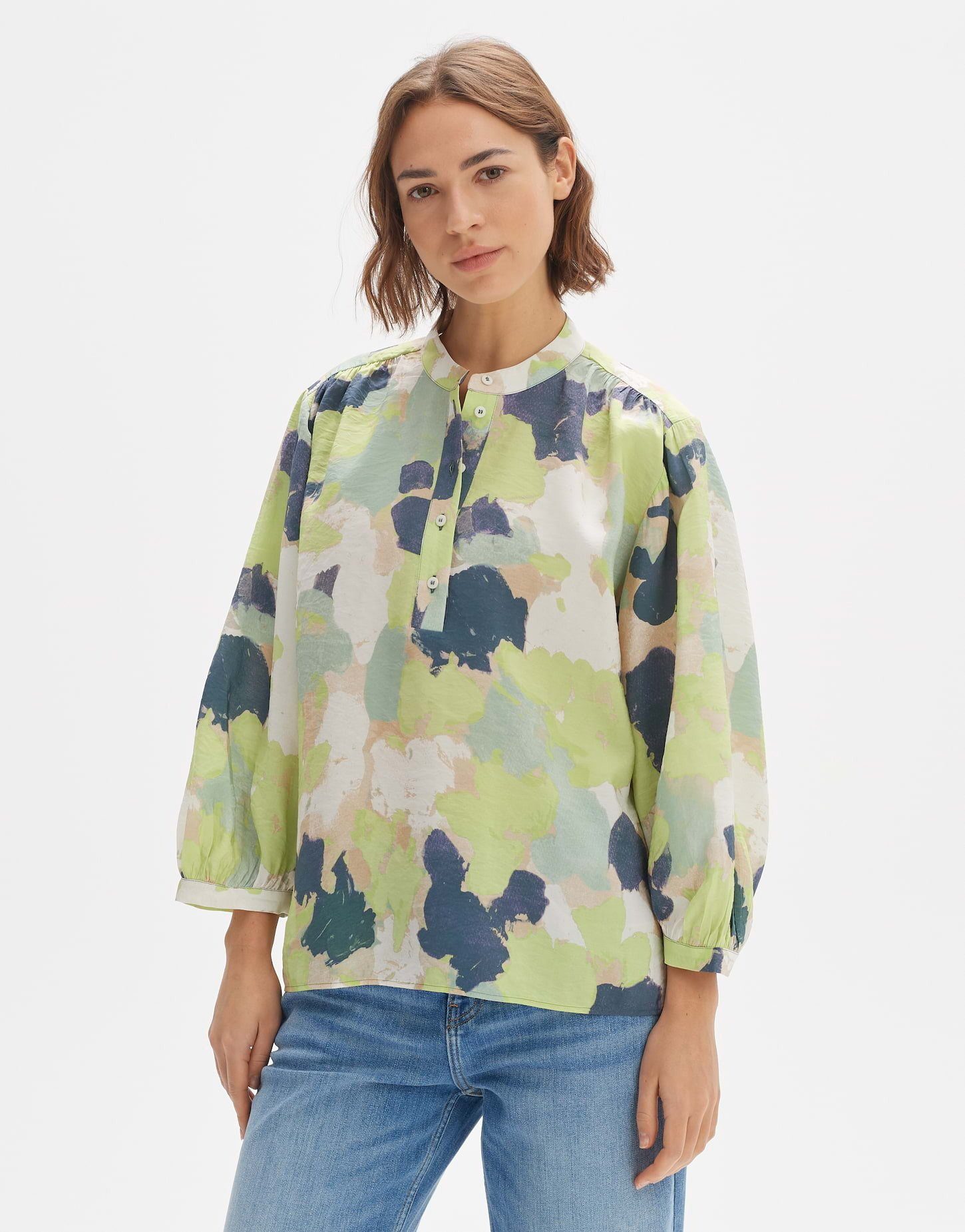 Die Tunikabluse mit einem natur-inspirierten Allover-Druck kommt in einer modernen Boxy Silhouette daher und kreiert einen femininen Frühlingslook, der Eleganz und Leichtigkeit vereint.