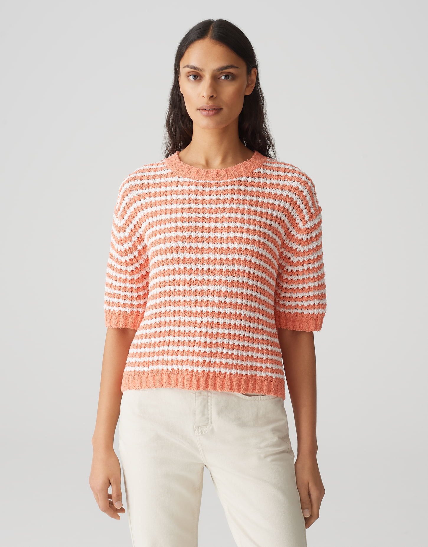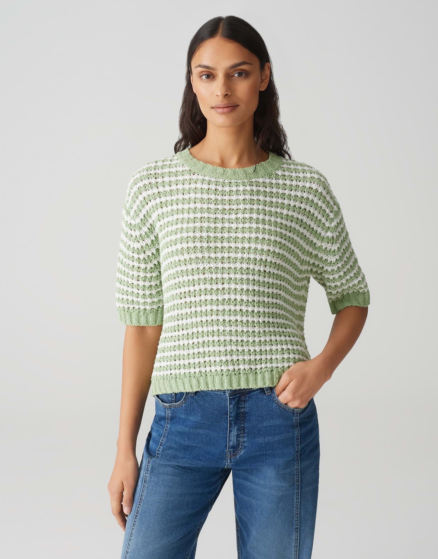 Das Strickshirt spielt ein klassisches Streifenmuster auf einem besonderen Baumwoll-Mix-Garn, das eine voluminöse Textur und eine lebhafte, dynamische Optik kreiert.