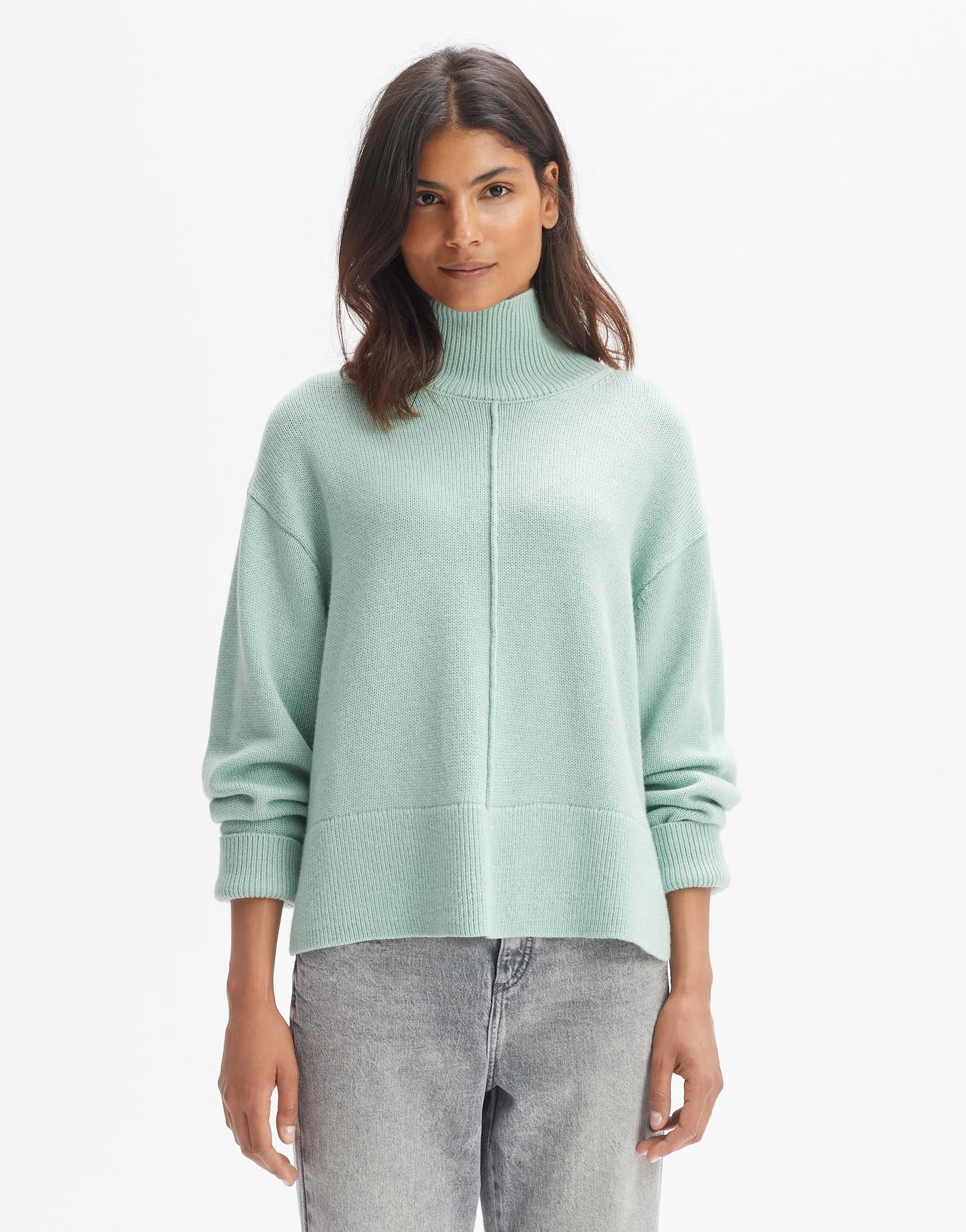 Der Strickpullover aus einem soften Woll-Mix lebt von den kleinen Details wie der mittleren Ziernaht und der hohen, abgesetzten Rippe an Kragen, Bund und Ärmelsaum. Die Silhouette ist pur und entspannt gehalten und mit weiten Ärmeln versehen – für einen maximalen Tragekomfort.