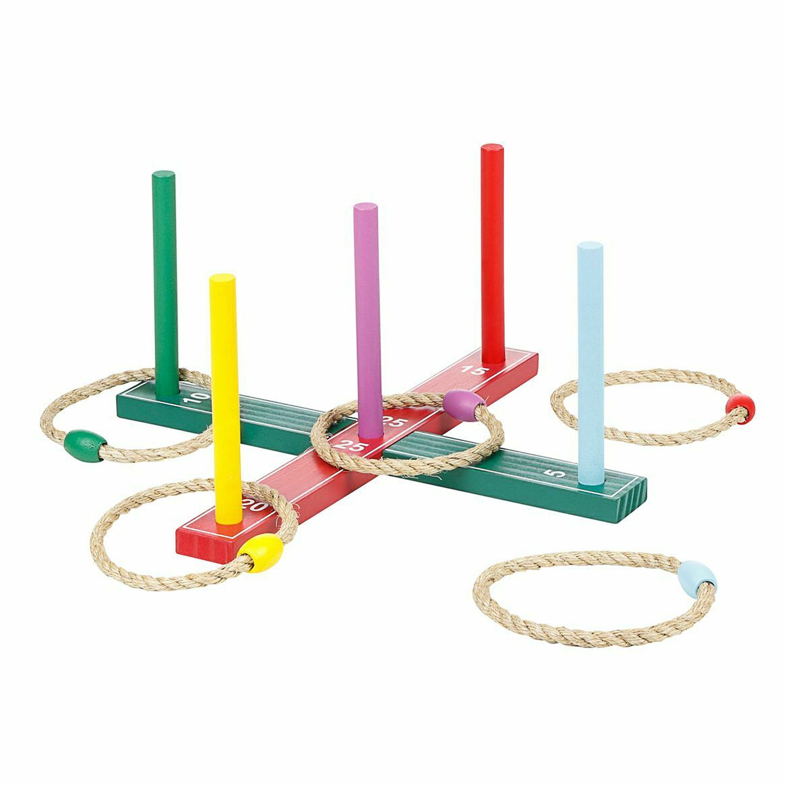 Einfache Regeln – Nach dem Aufbau werfen die Spieler abwechselnd 5 Ringe. Wer die meisten Punkte erzielt, gewinnt.