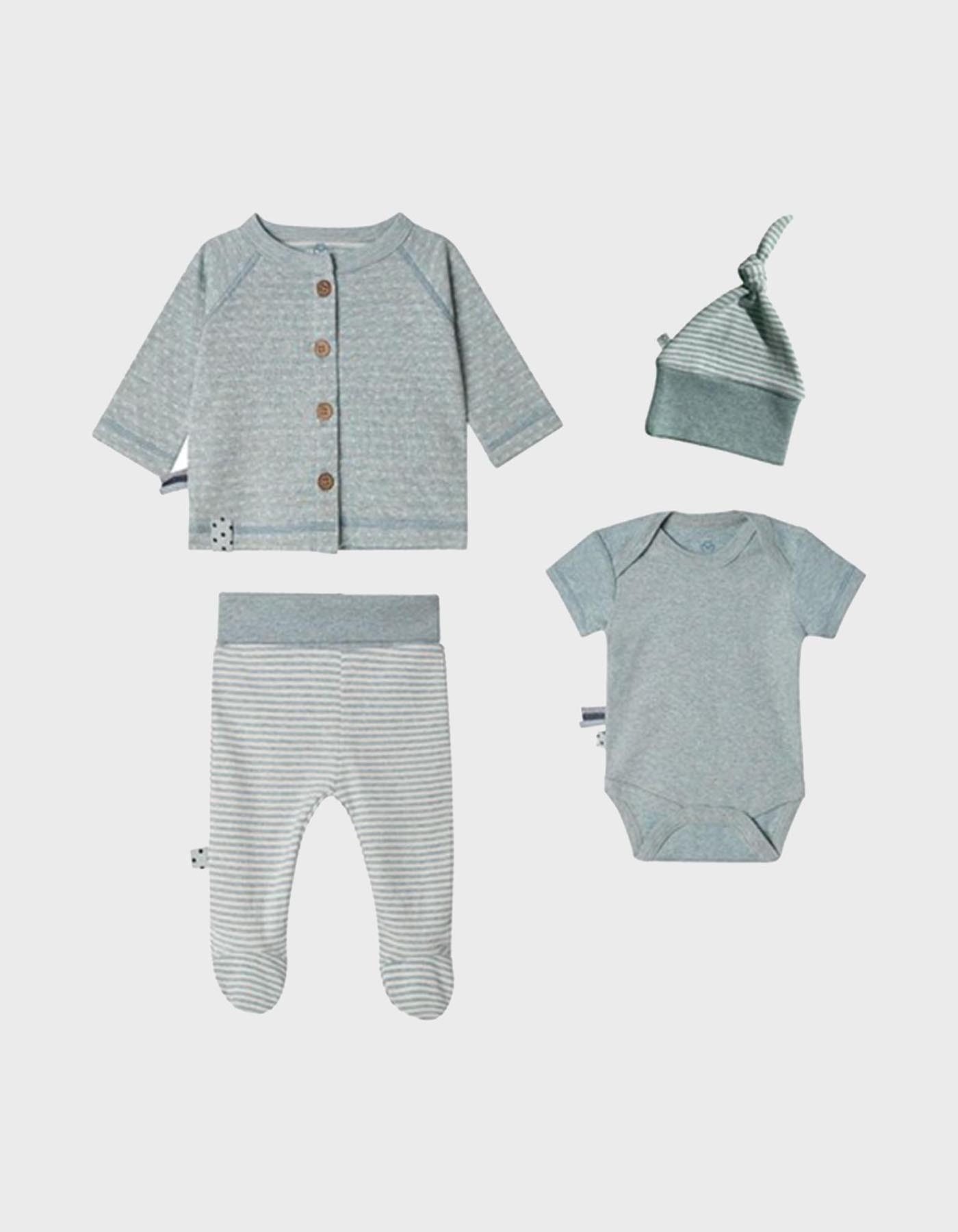 • Vielseitiges Set – Enthält Langarmjacke, Bodysuit, Babyhose mit Füßen, Mütze und Musselin-Geschenkbeutel