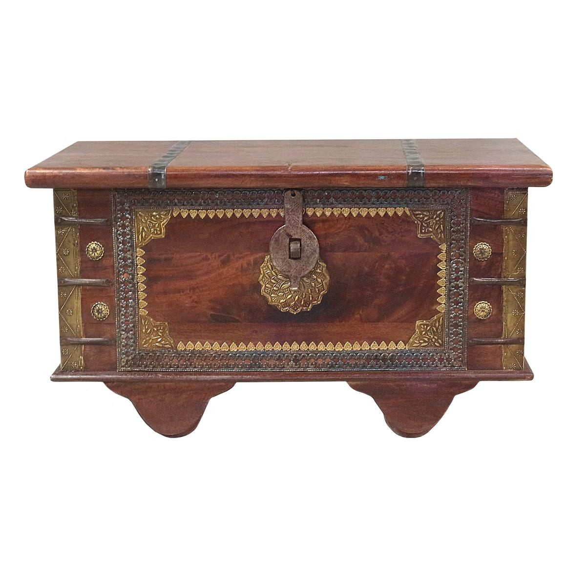 Die einzigartige Truhe wurde in liebevoller Handarbeit aus hochwertigem Palisanderholz in Indien gefertigt. Das antike Dekor der Truhe besticht besonders durch die altertümlichen Messingbeschläge.