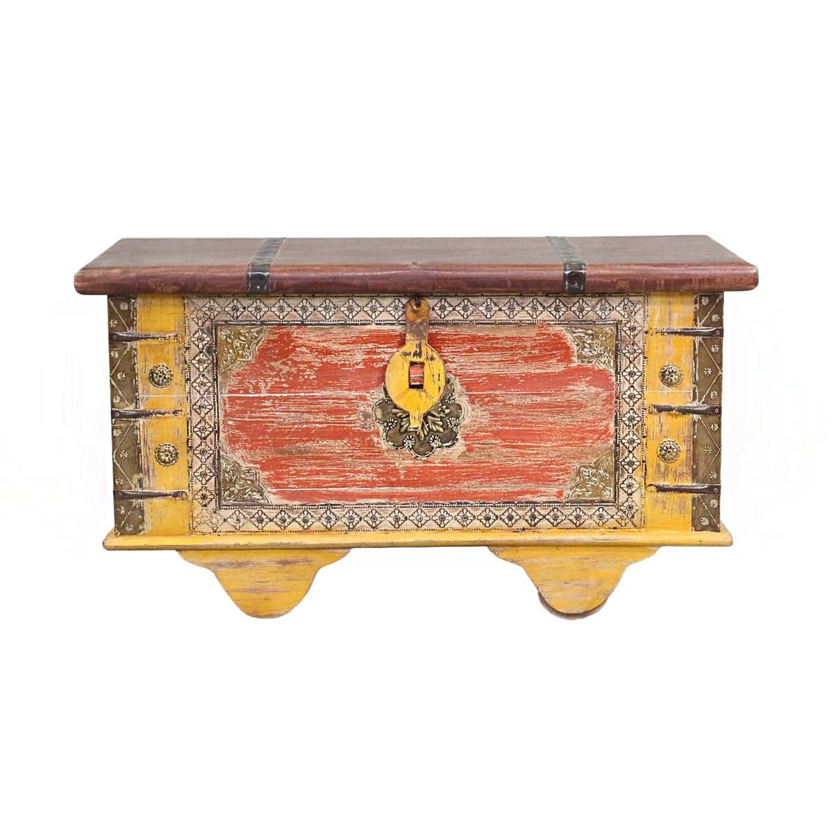 Die einzigartige Truhe wurde in liebevoller Handarbeit aus hochwertigem Mangoholz in Indien gefertigt. Das antike Dekor der Truhe besticht besonders durch die altertümlichen Messingbeschläge. Zusätzlich wurde die Truhe in bunten Farben gefasst und anschließend stellenweise wieder grob abgebürstet. So erhält die Holztruhe den modernen Shabby Chic Stil und wirkt damit besonders geschichtsträchtig und kostbar.