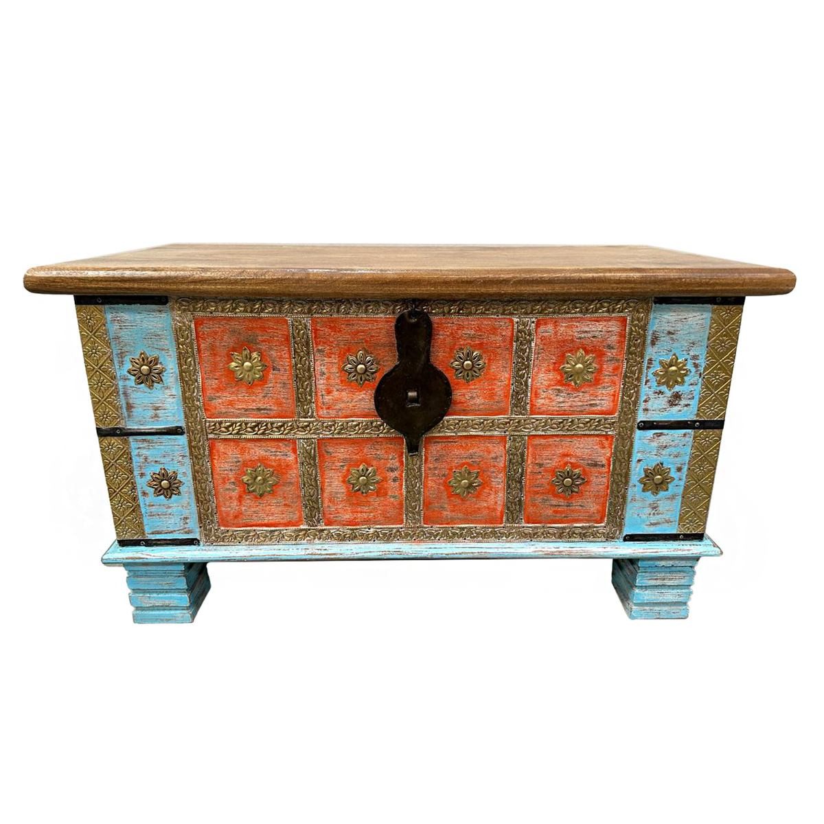 Oriental Galerie Truhe Indische Truhe Türkis Orange 80 cm (1 St), Beistelltisch, Holztruhe, Antik, Wäschetruhe, Möbeltruhe, Holzkiste